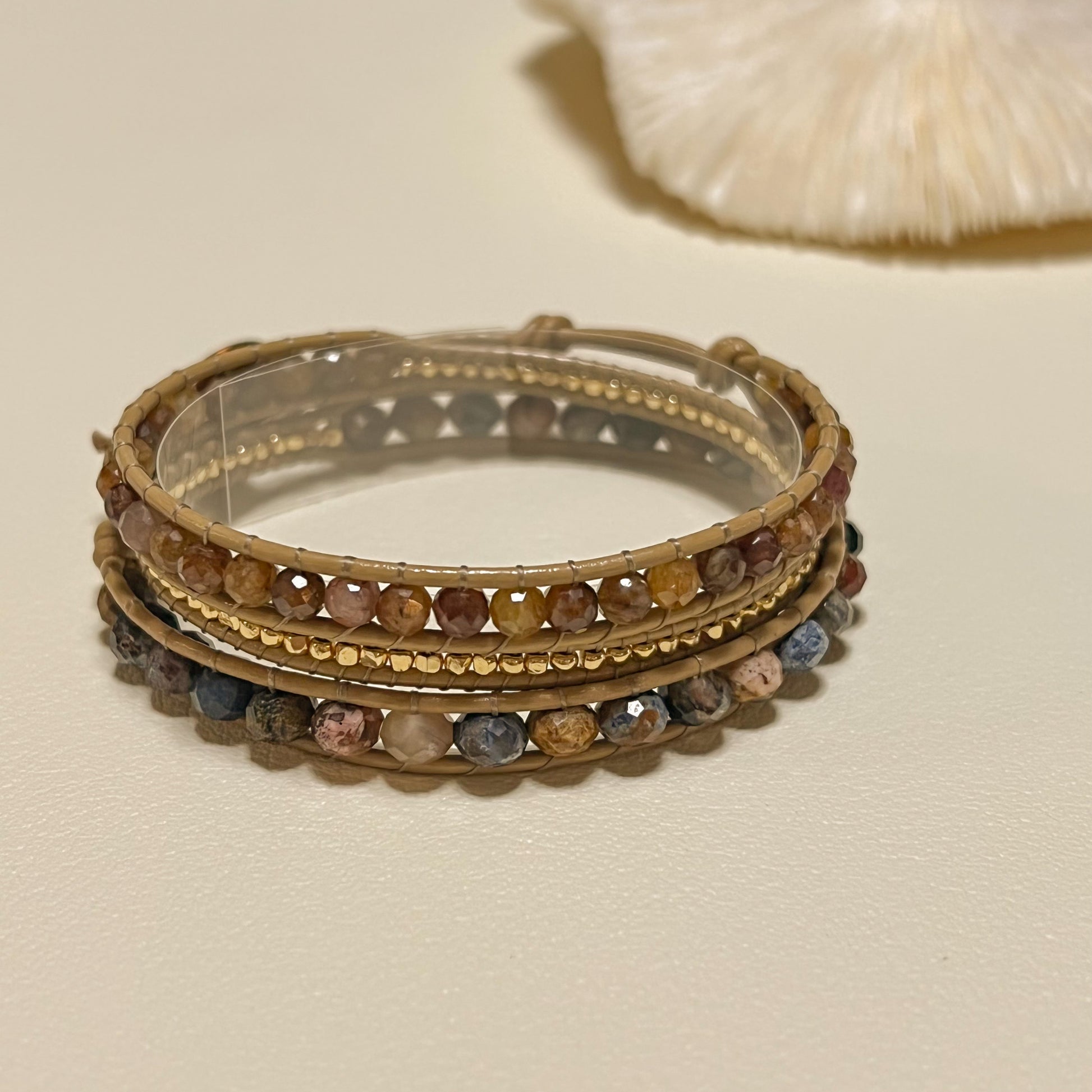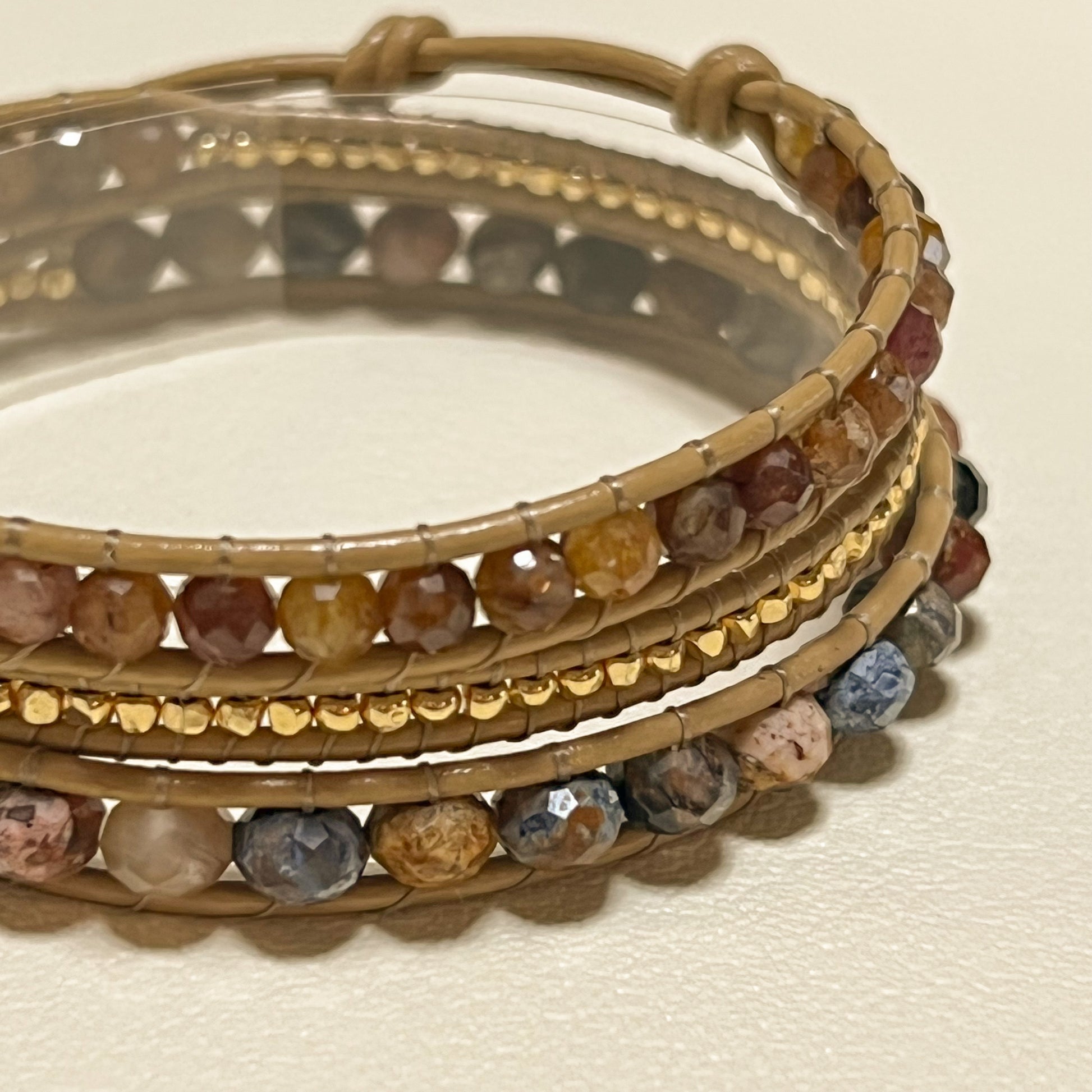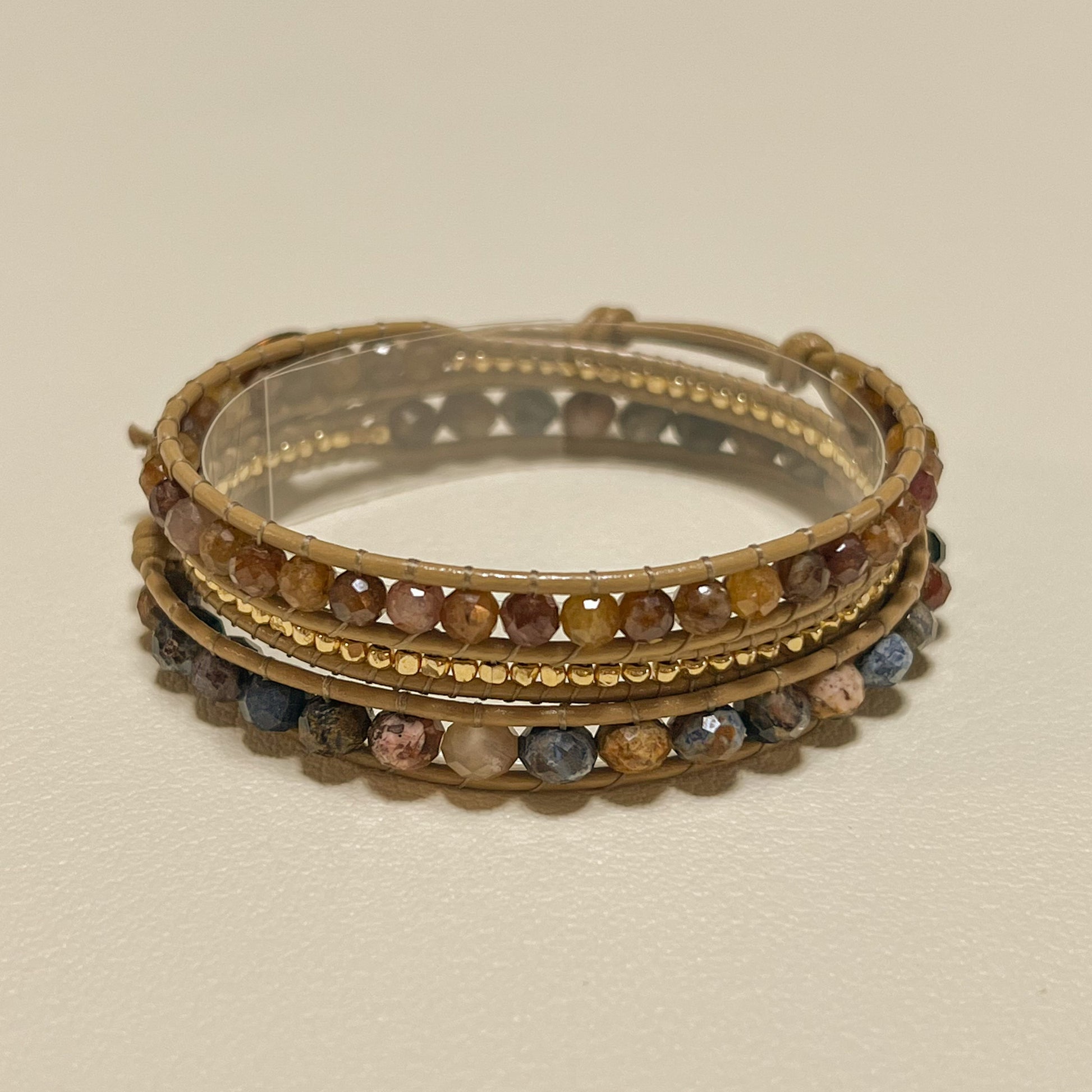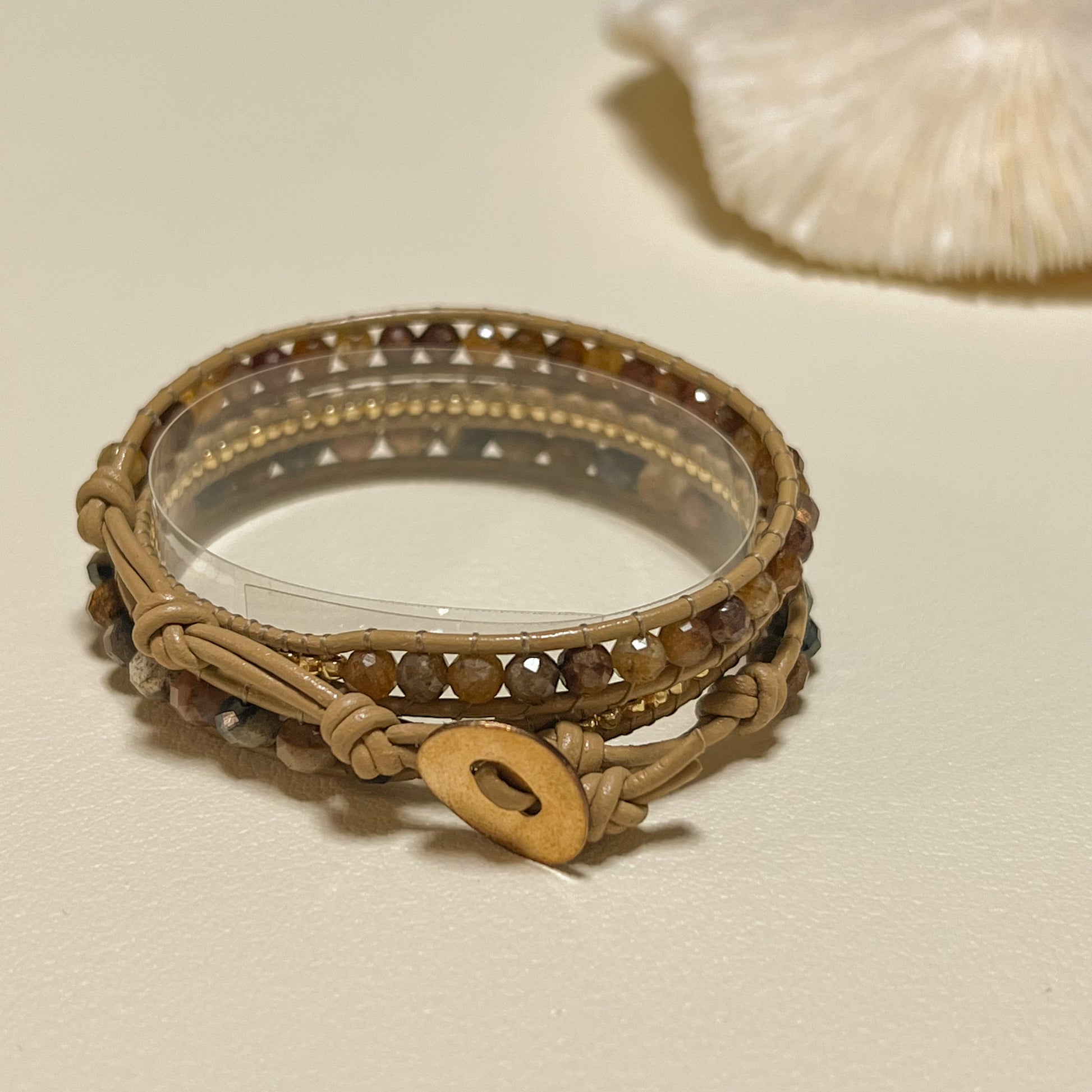 ピーターサイト、イエローサファイア、ガラスビーズ、バフレザーコード、真鍮ボタン