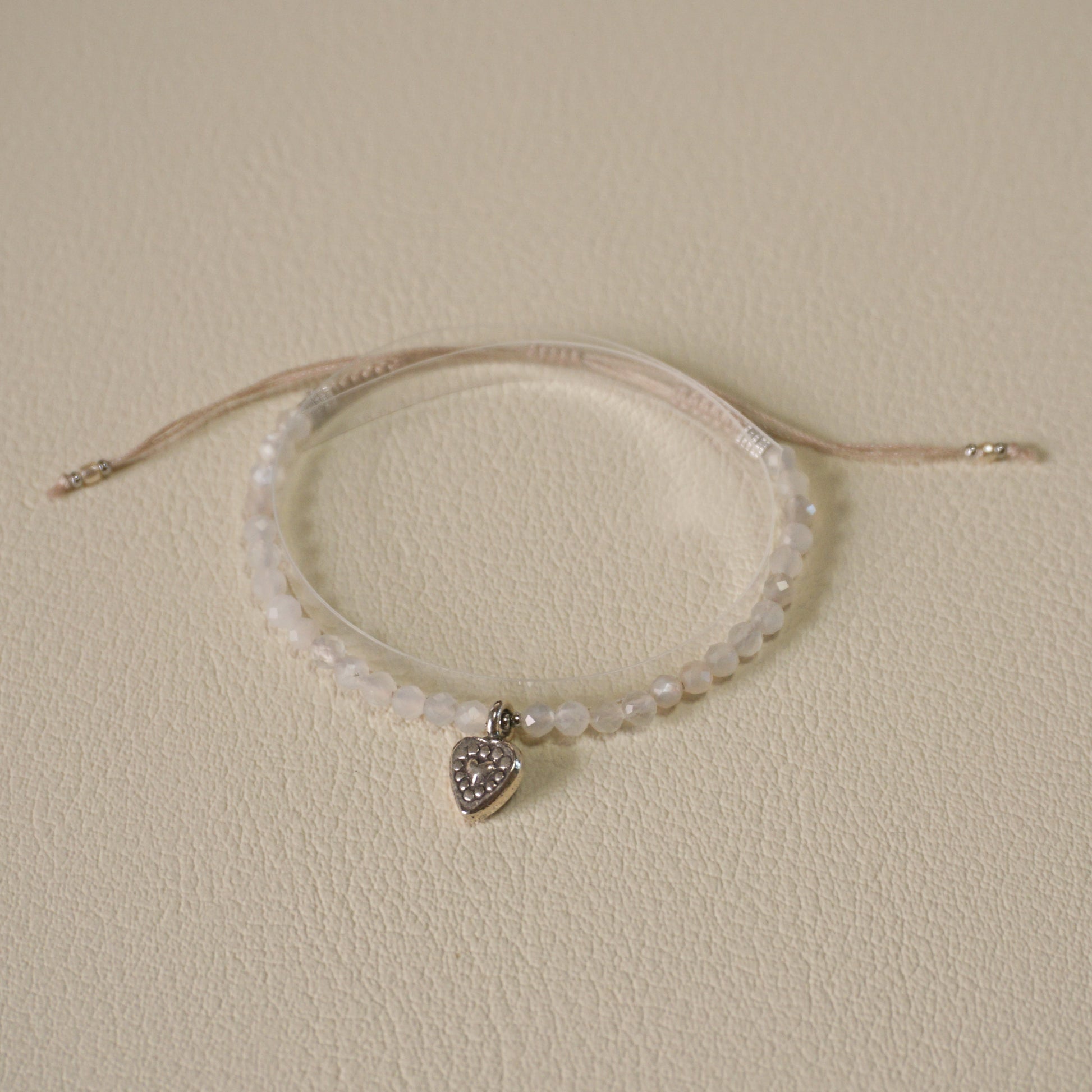 カレンシルバーハートチャーム、ホワイトムーンストーン、ガラスビーズ、メタルビーズ、エジプト綿紐