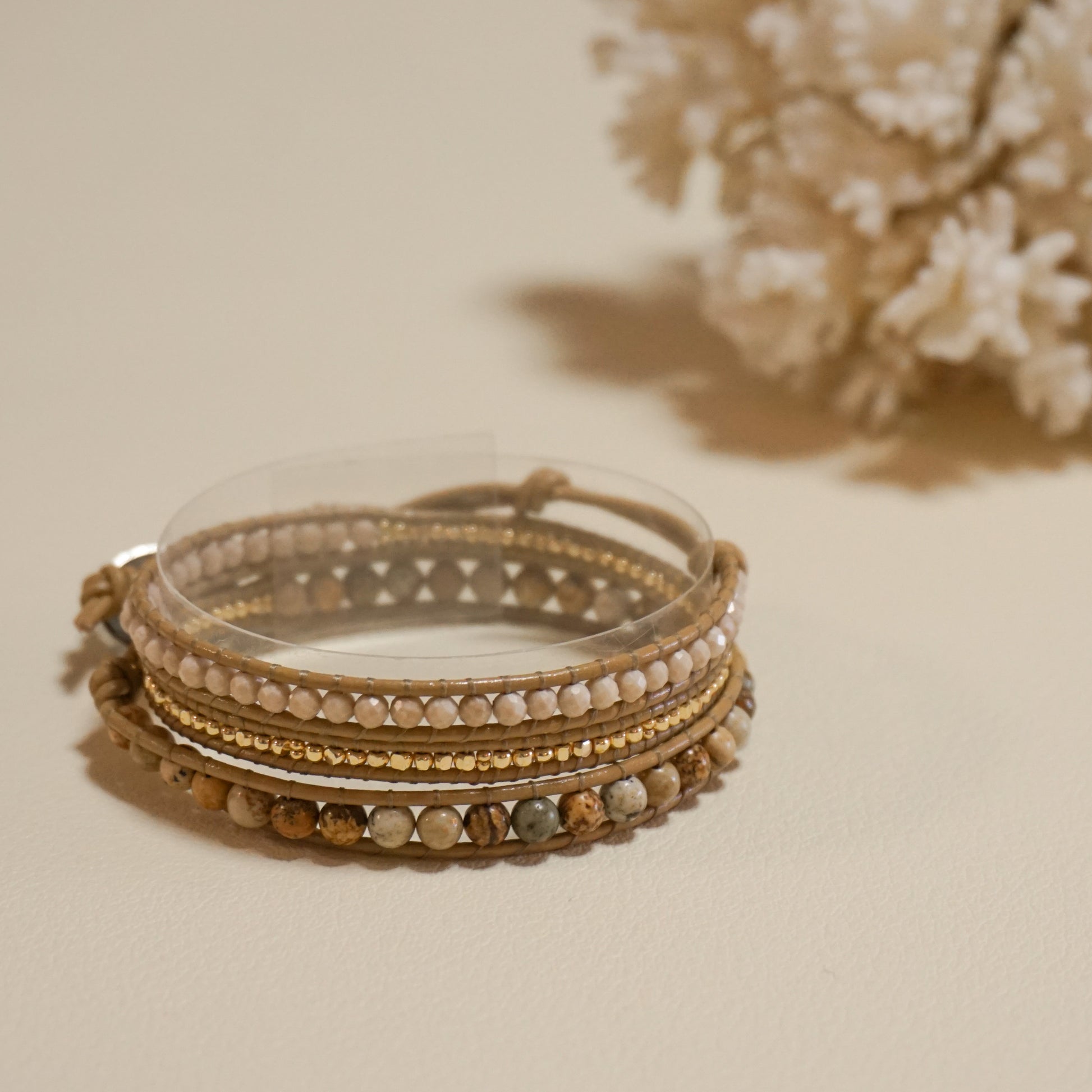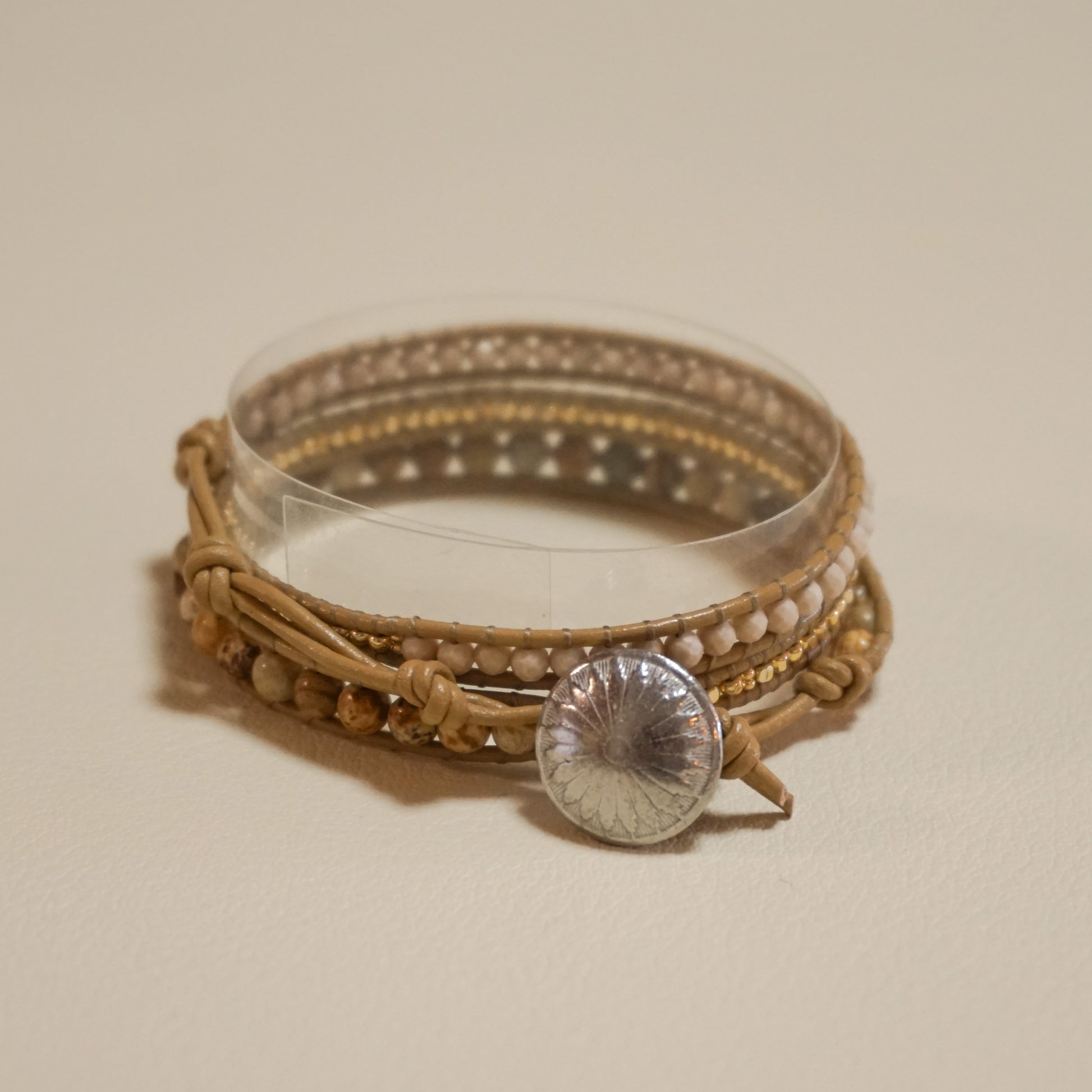 ピクチャージャスパー、リバーストーン、ガラスビーズ、メタルビーズ、バフレザーコード、ニッケルボタン