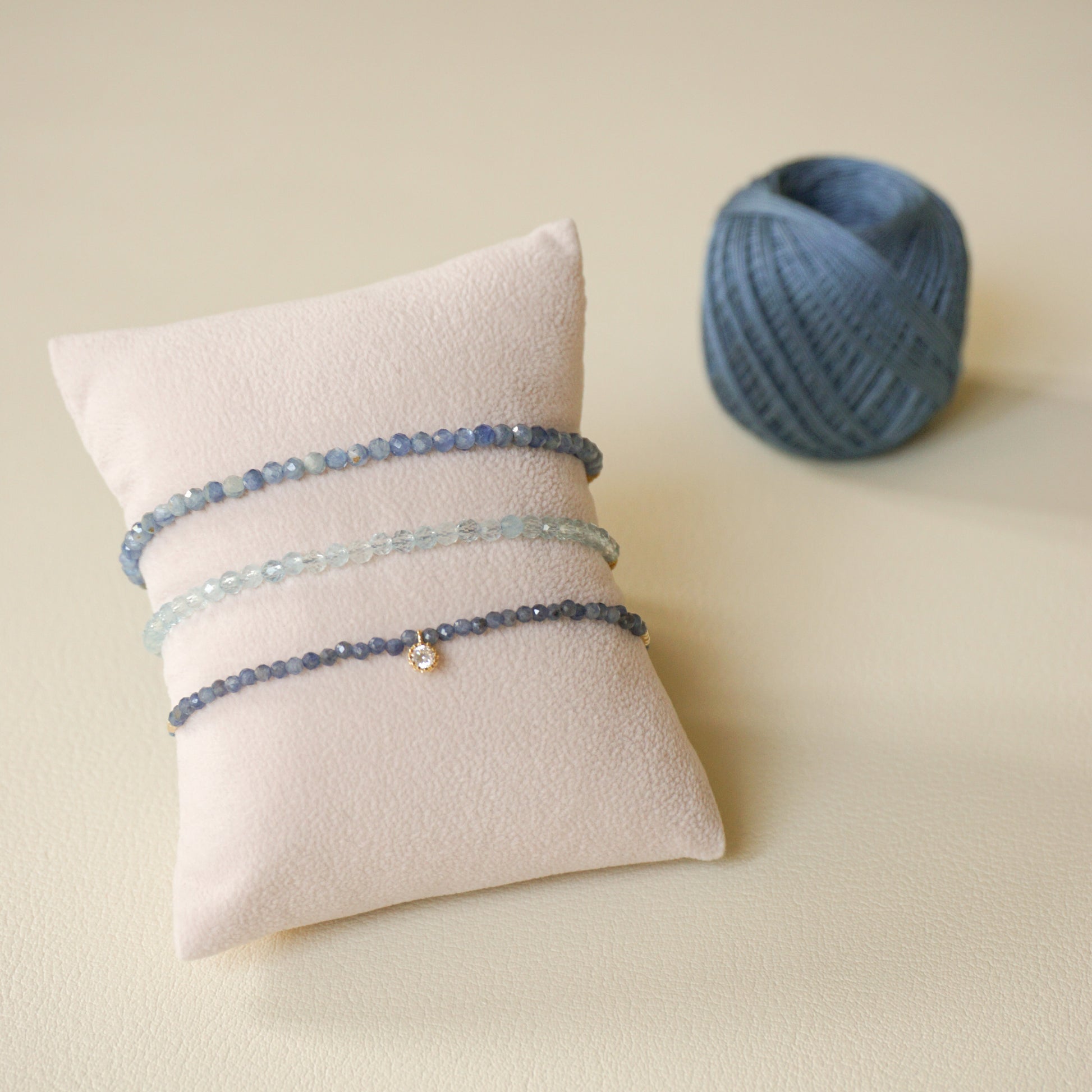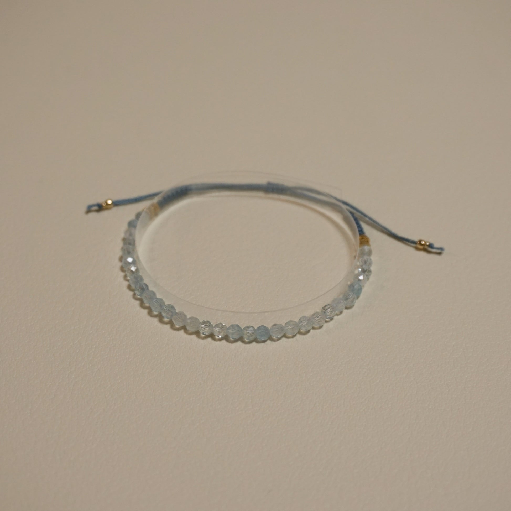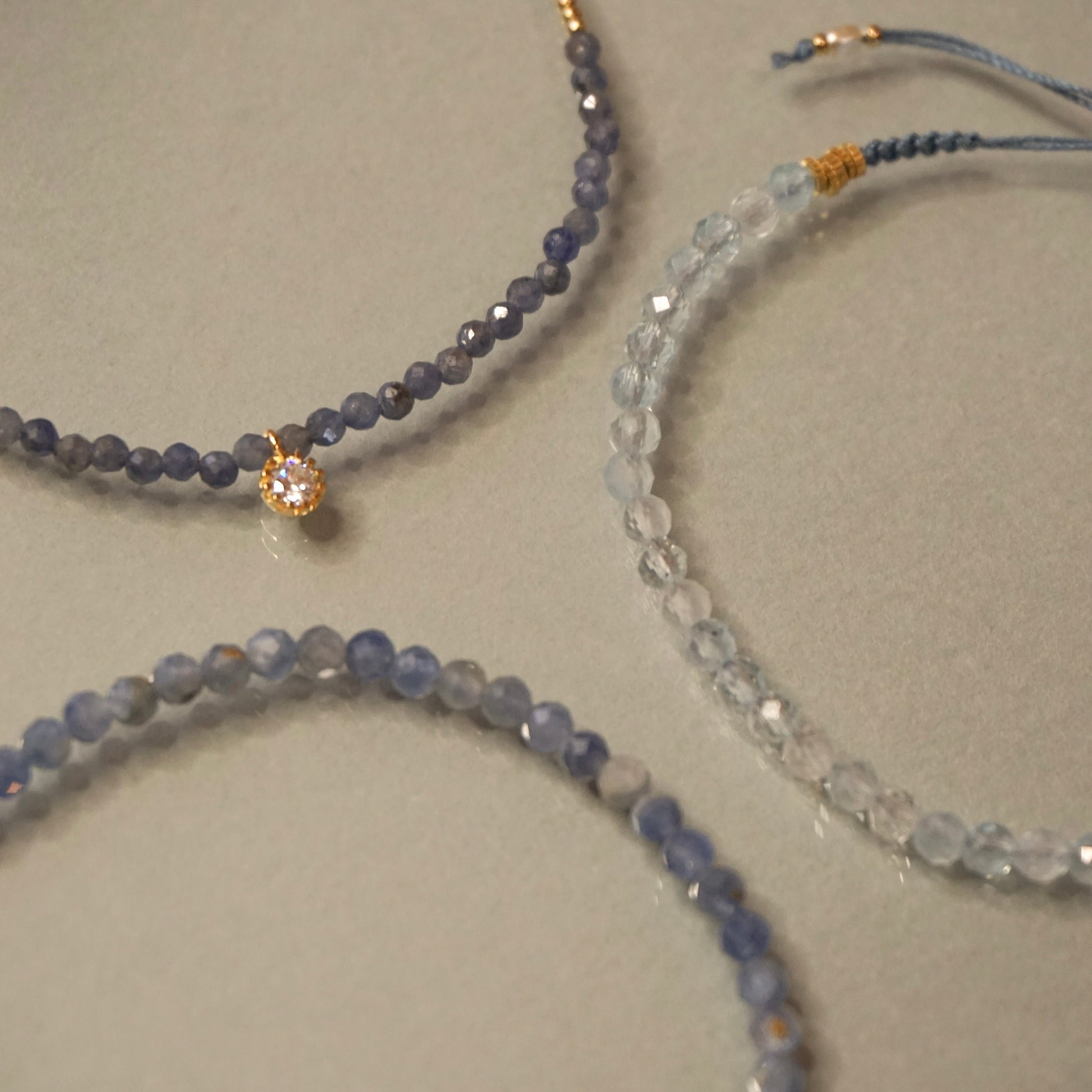 アクアマリン、ガラスビーズ、メタルビーズ、エジプト綿紐