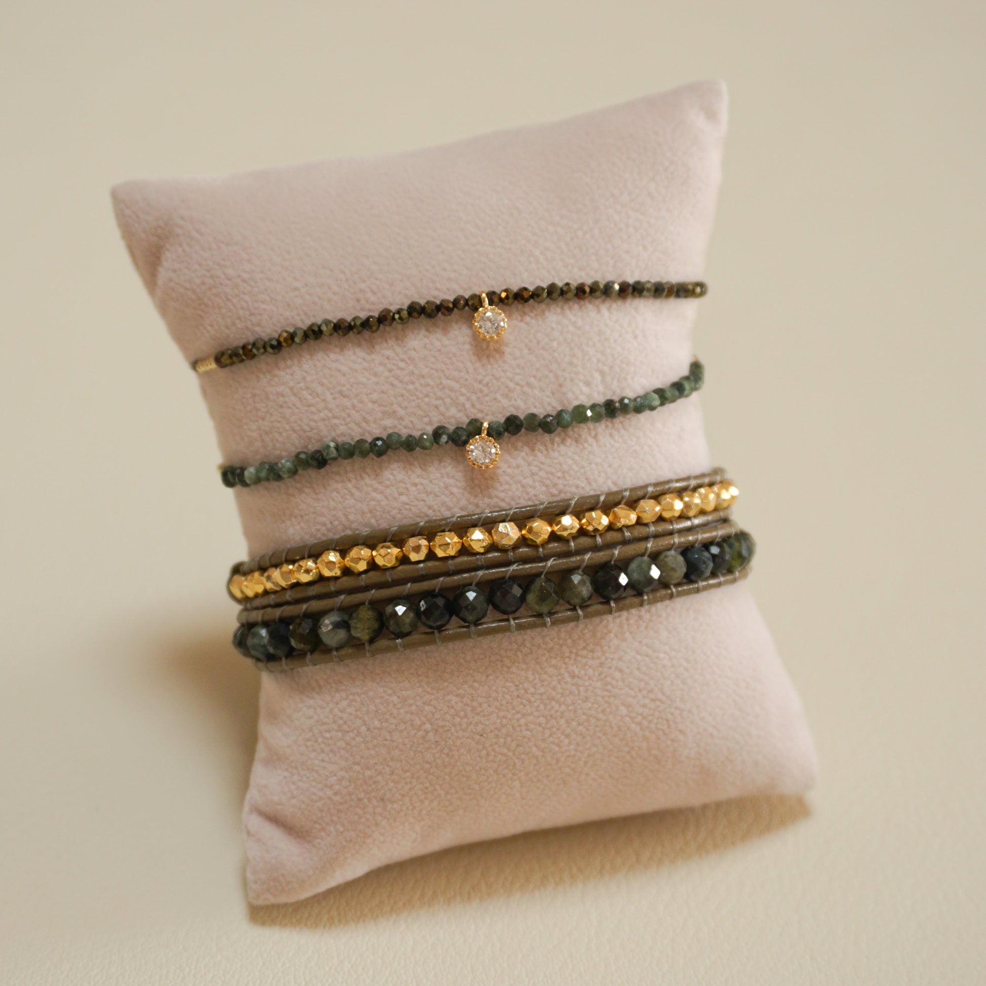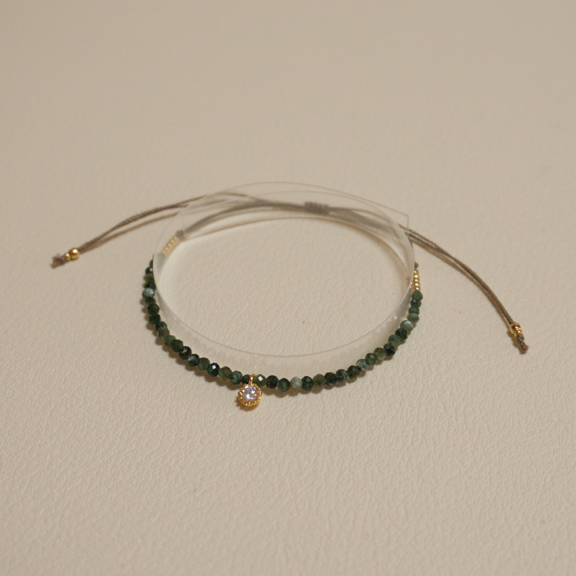 セラフィナイト、真鍮キュービックジルコニアチャーム、ガラスビーズ、メタルビーズ、エジプト綿紐