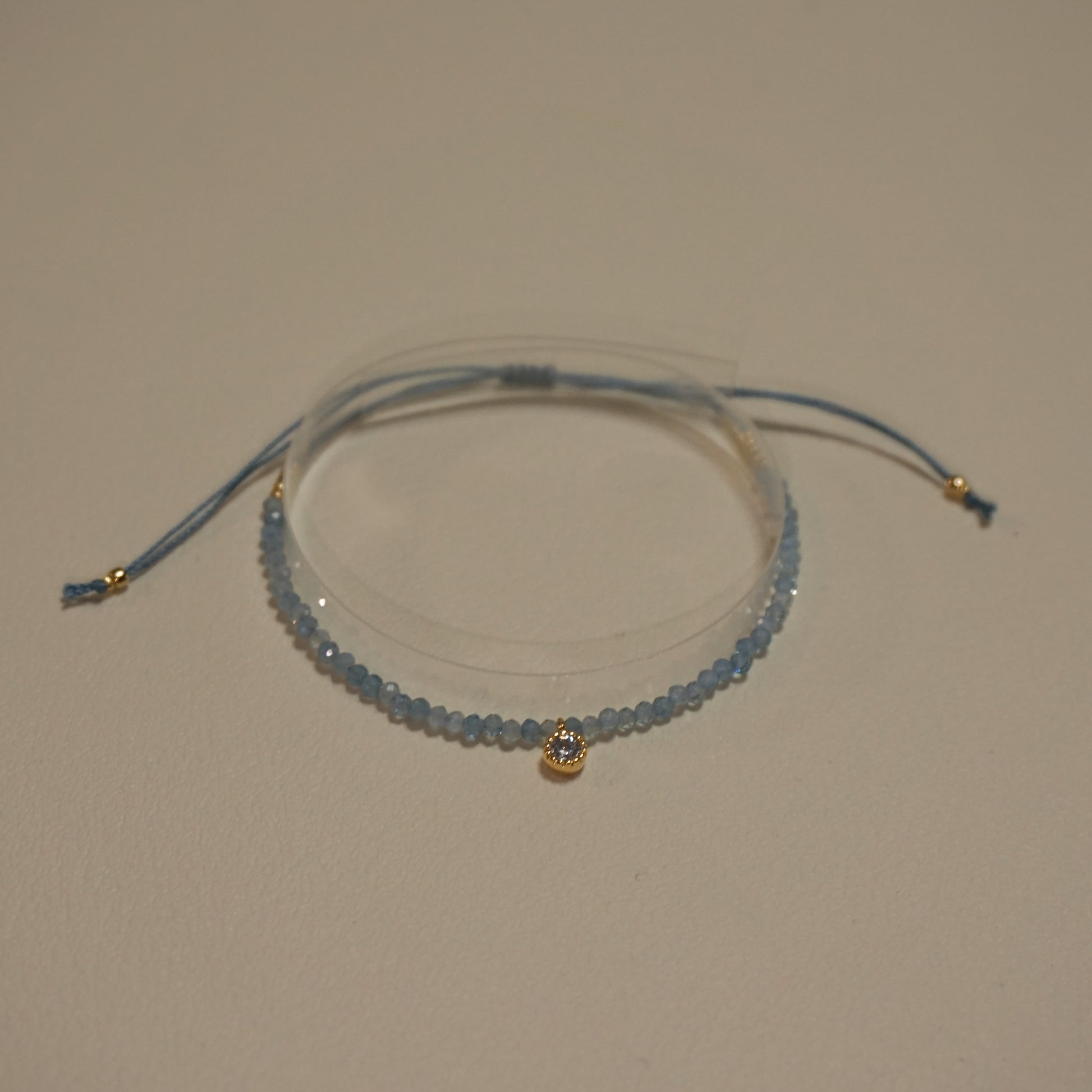 アクアマリン、ロジウムキュービックジルコニアチャーム、ガラスビーズ、メタルビーズ、エジプト綿紐