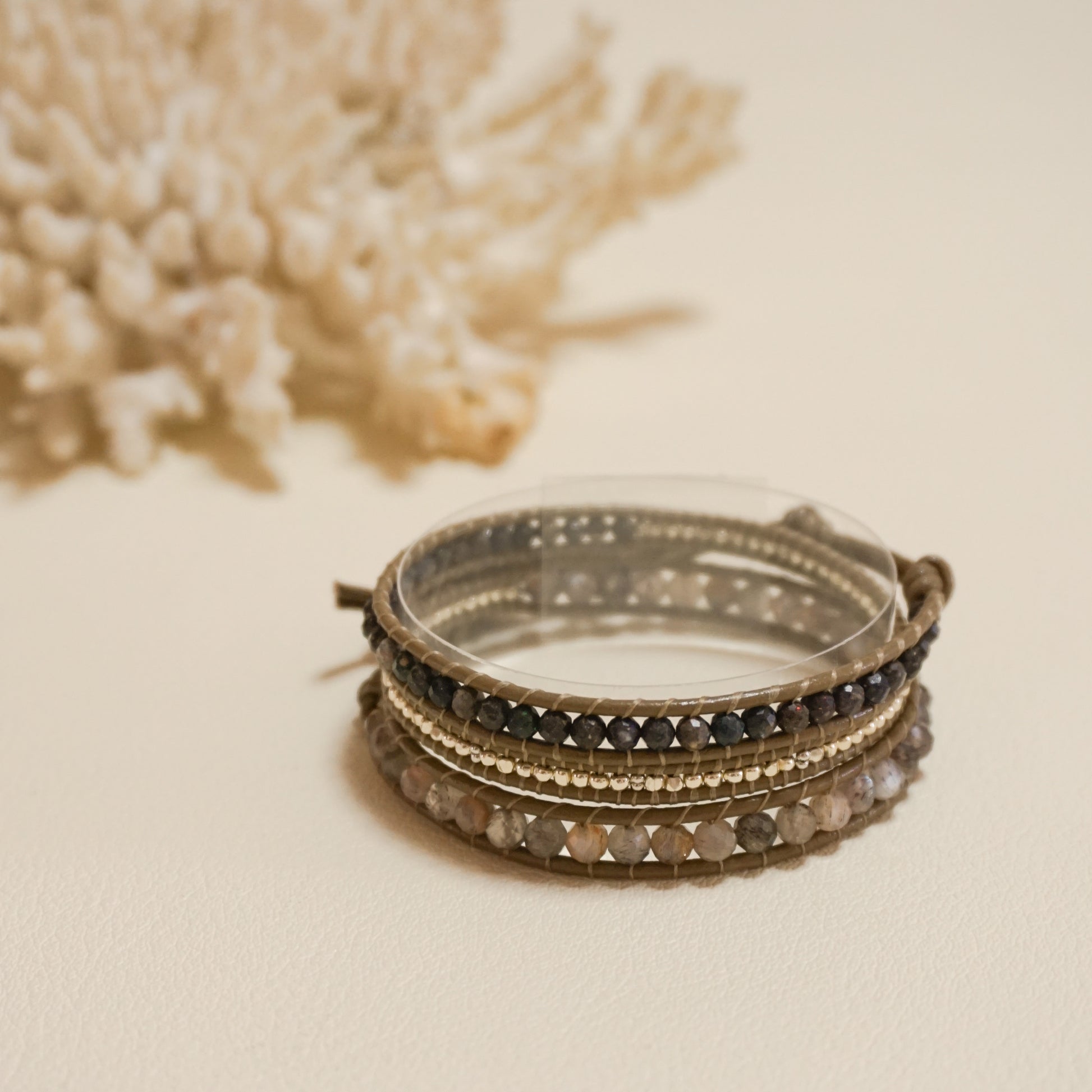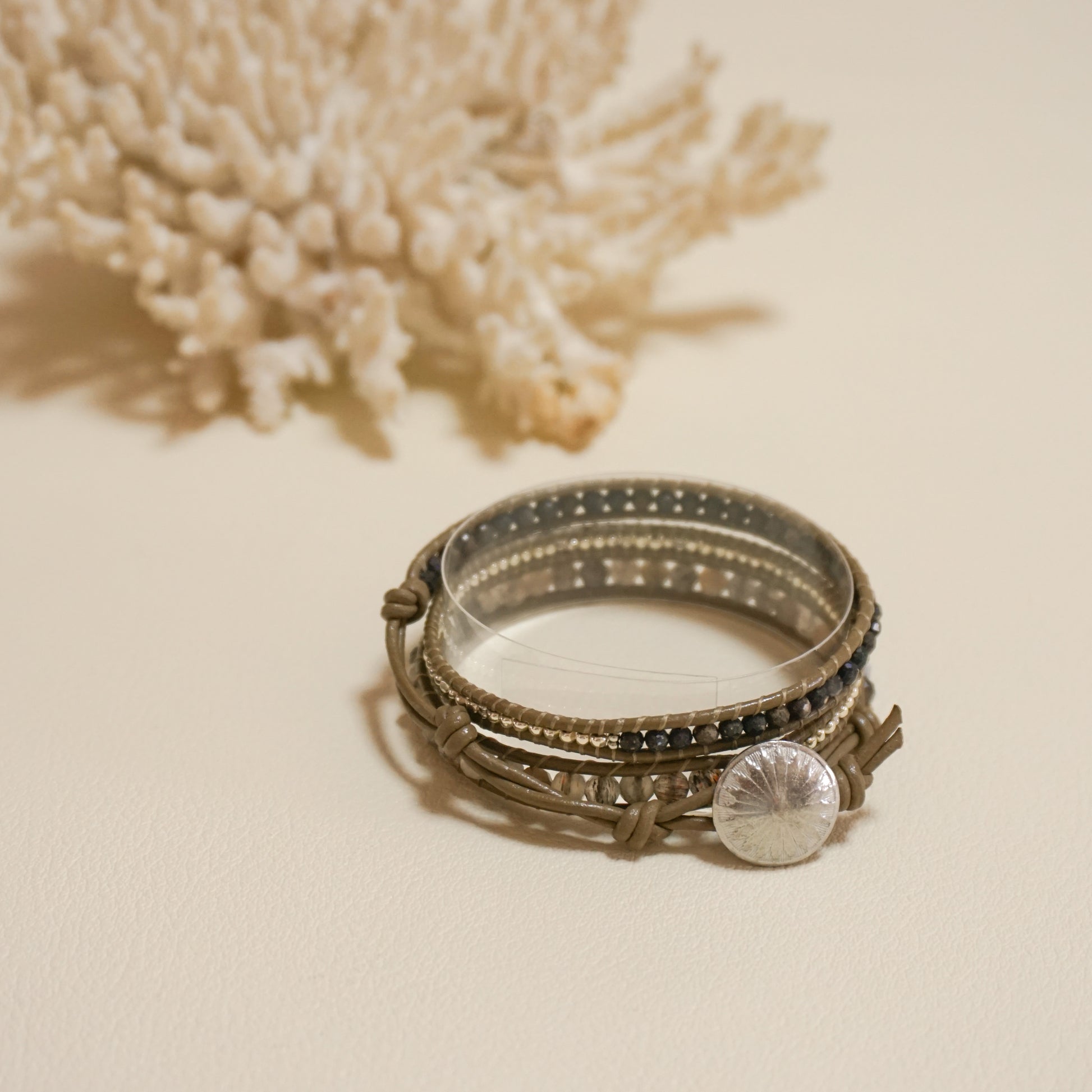 グレームーンストーン、ブラックオパール、ガラスビーズ、メタルビーズ、バフレザーコード、ニッケルボタン