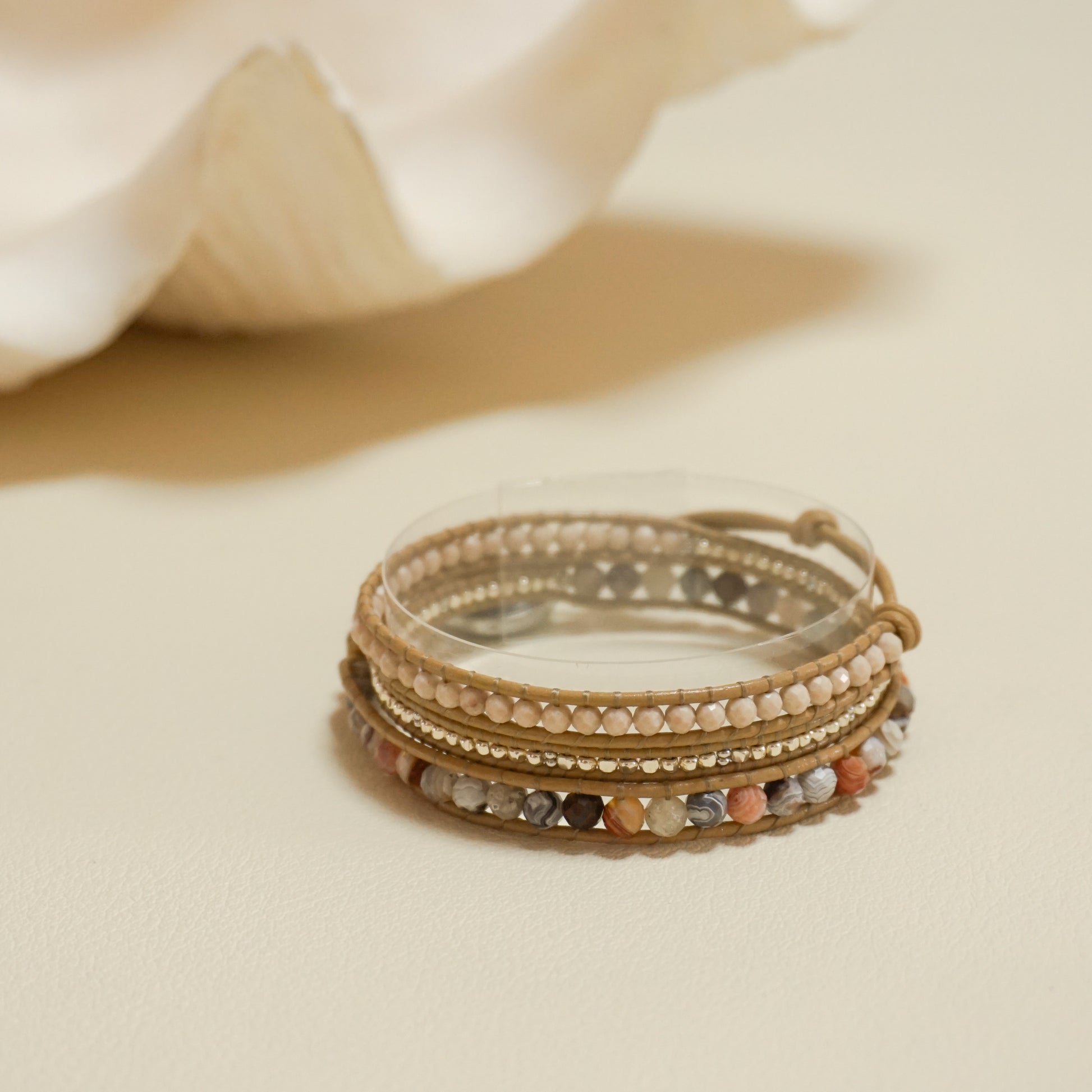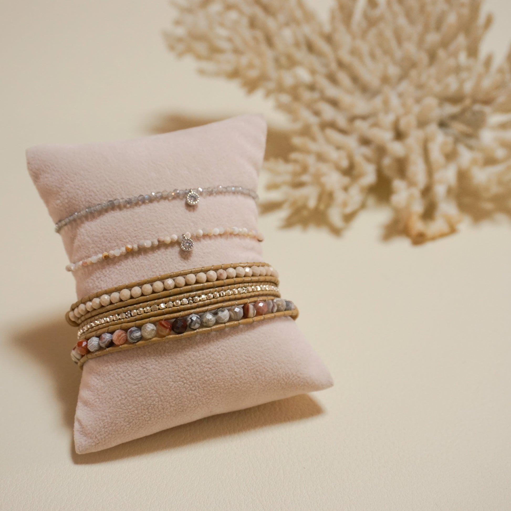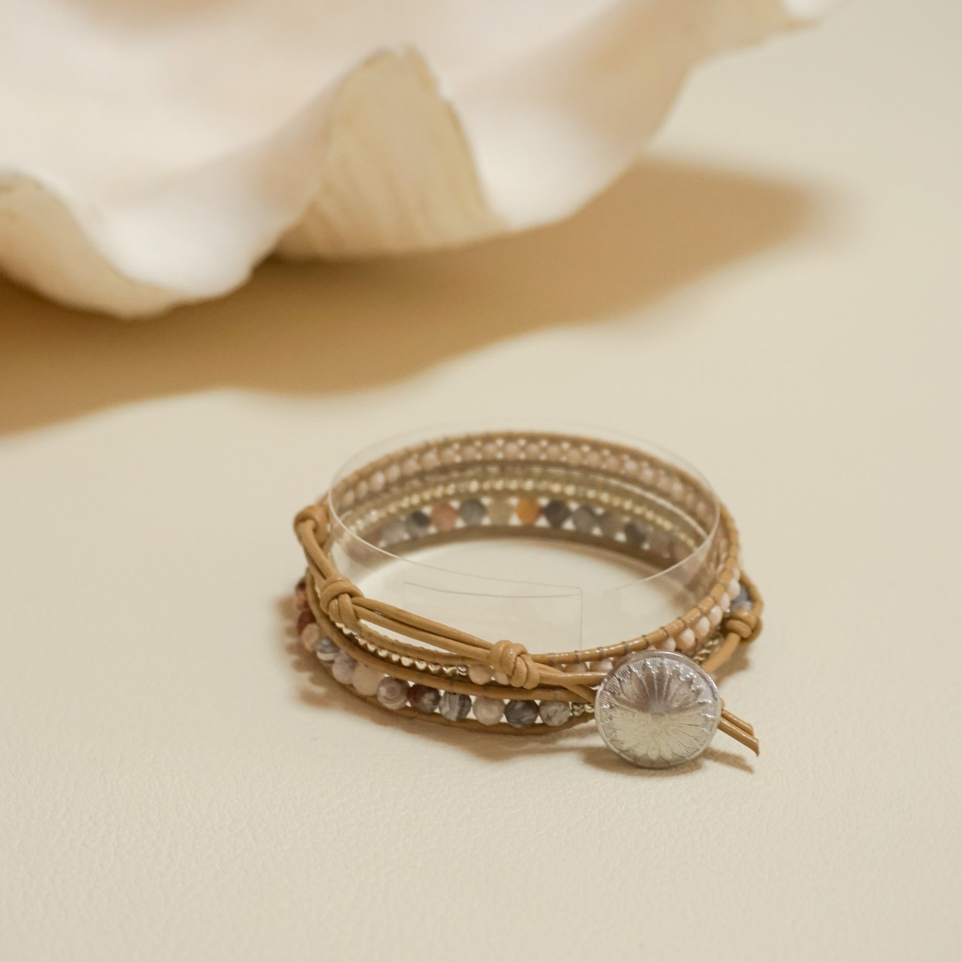 ラグナレースアゲート、リバーストーン、ガラスビーズ、メタルビーズ、バフレザーコード、ニッケルボタン