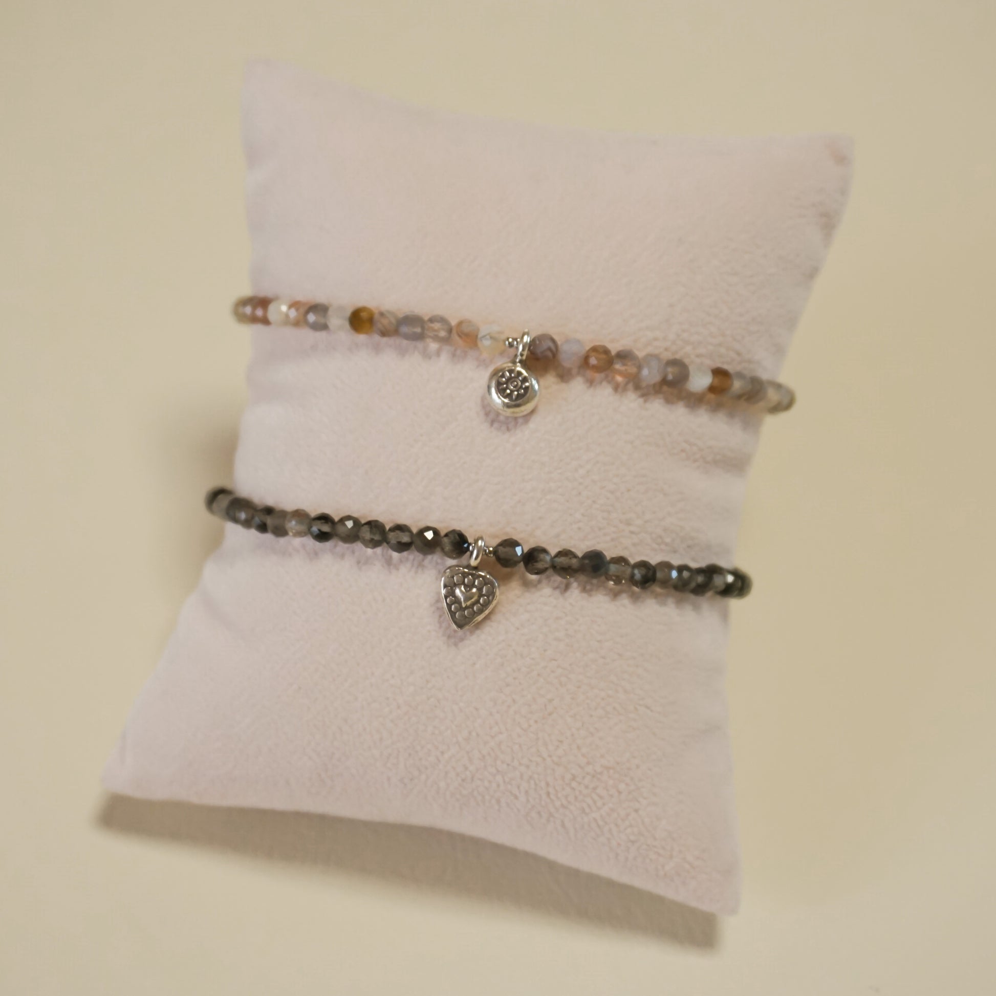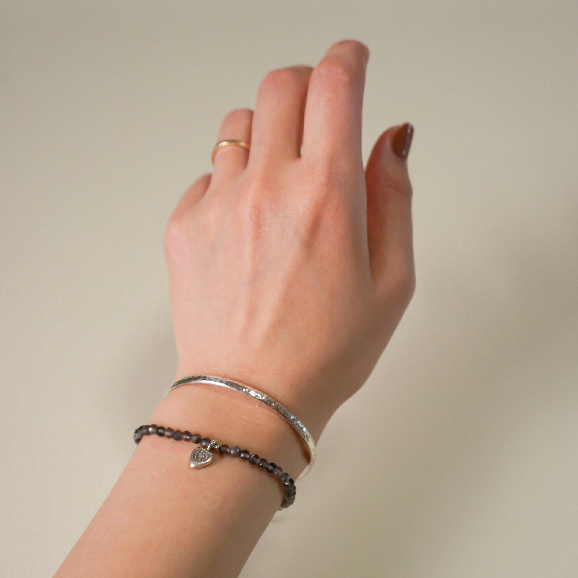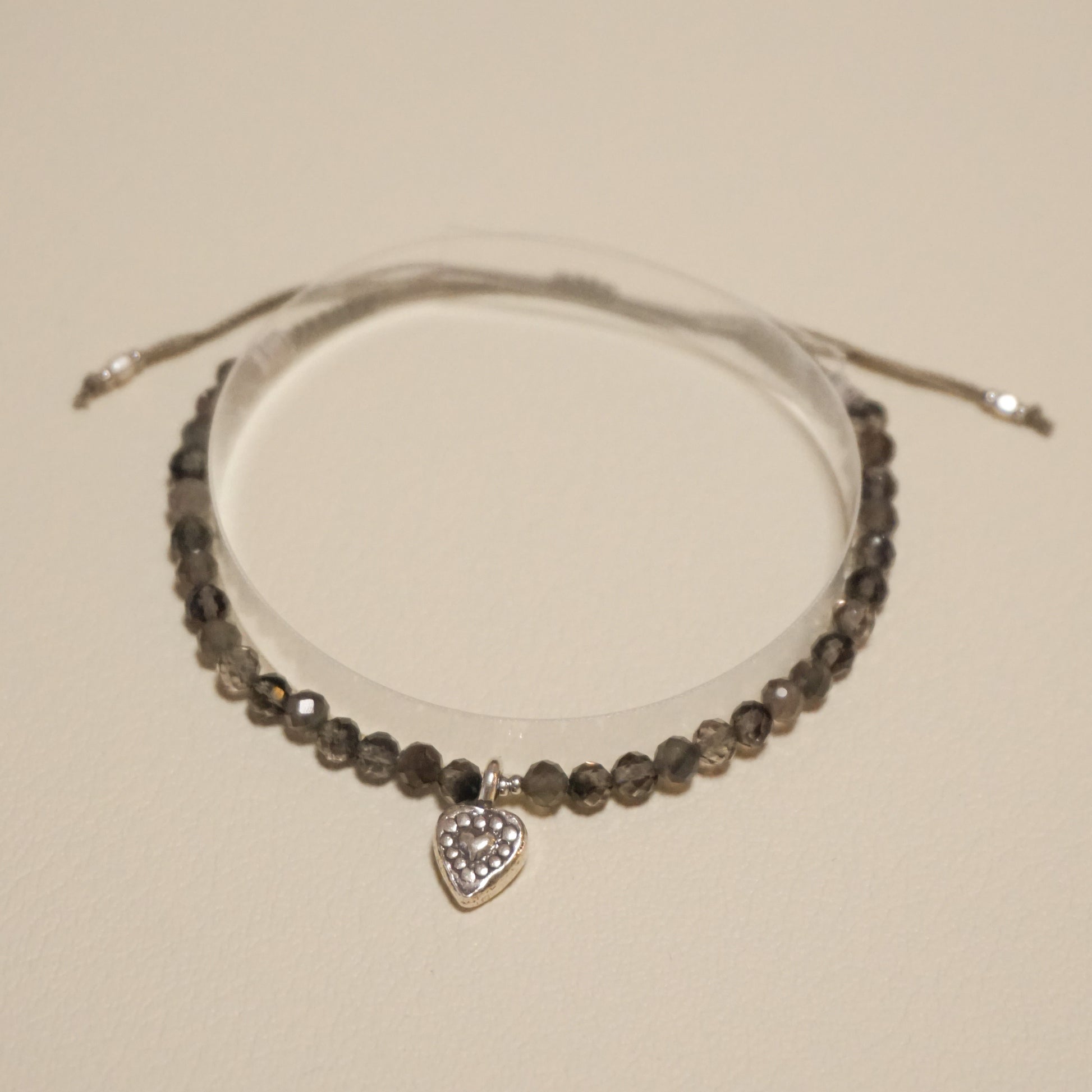 カレンシルバーハートチャーム、ミッドナイトレースオブシディアン、ガラスビーズ、メタルビーズ、エジプト綿紐