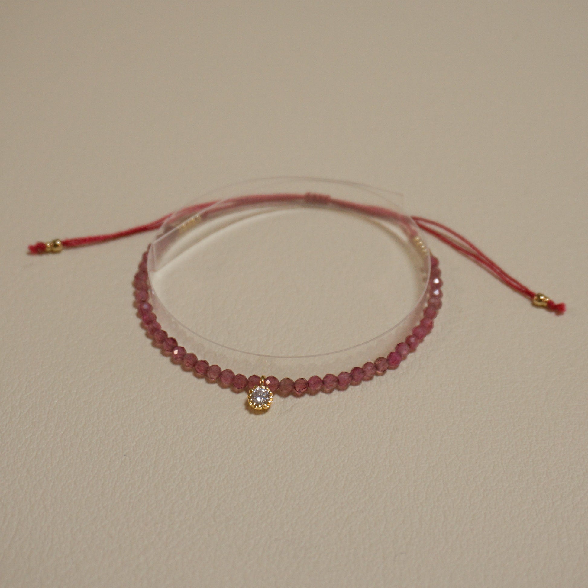 ピンクトルマリン、真鍮キュービックジルコニアチャーム、ガラスビーズ、メタルビーズ、エジプト綿紐