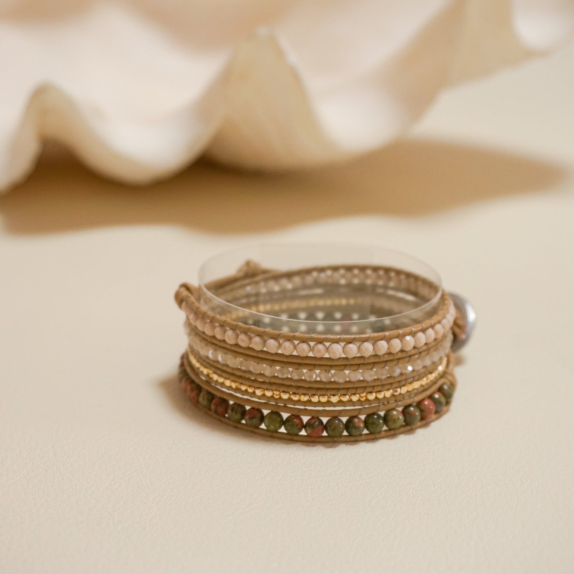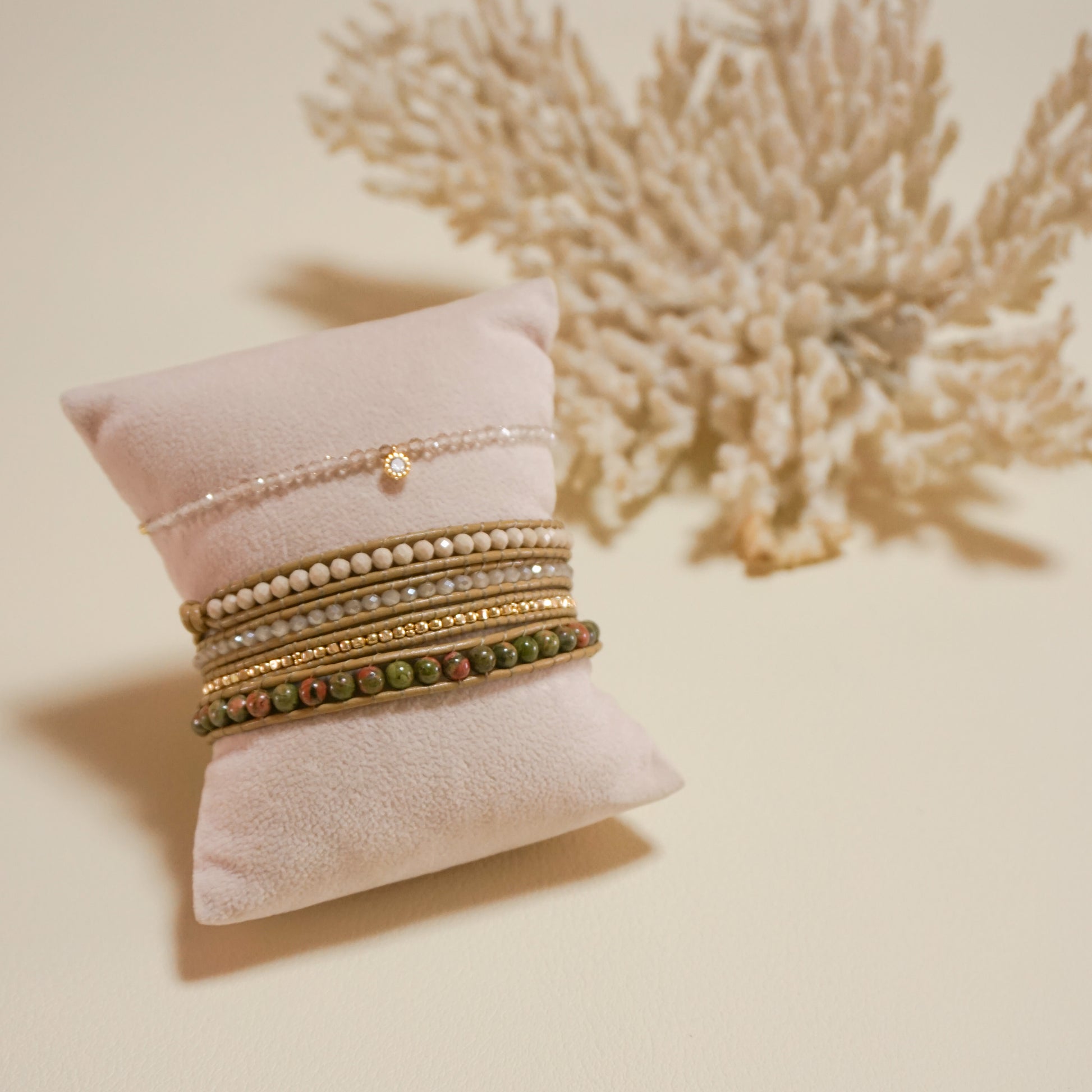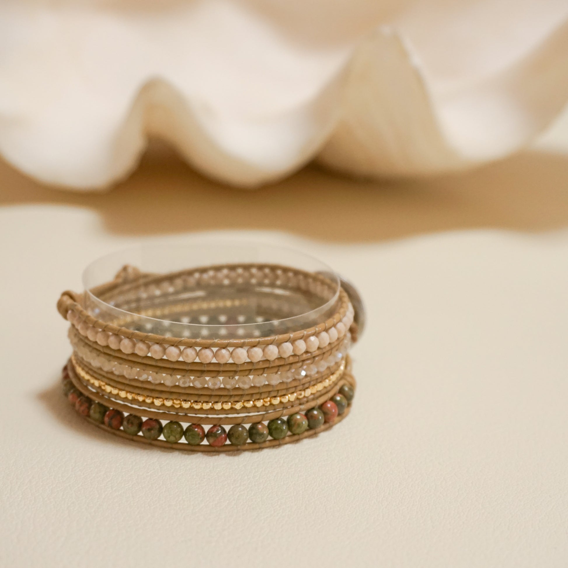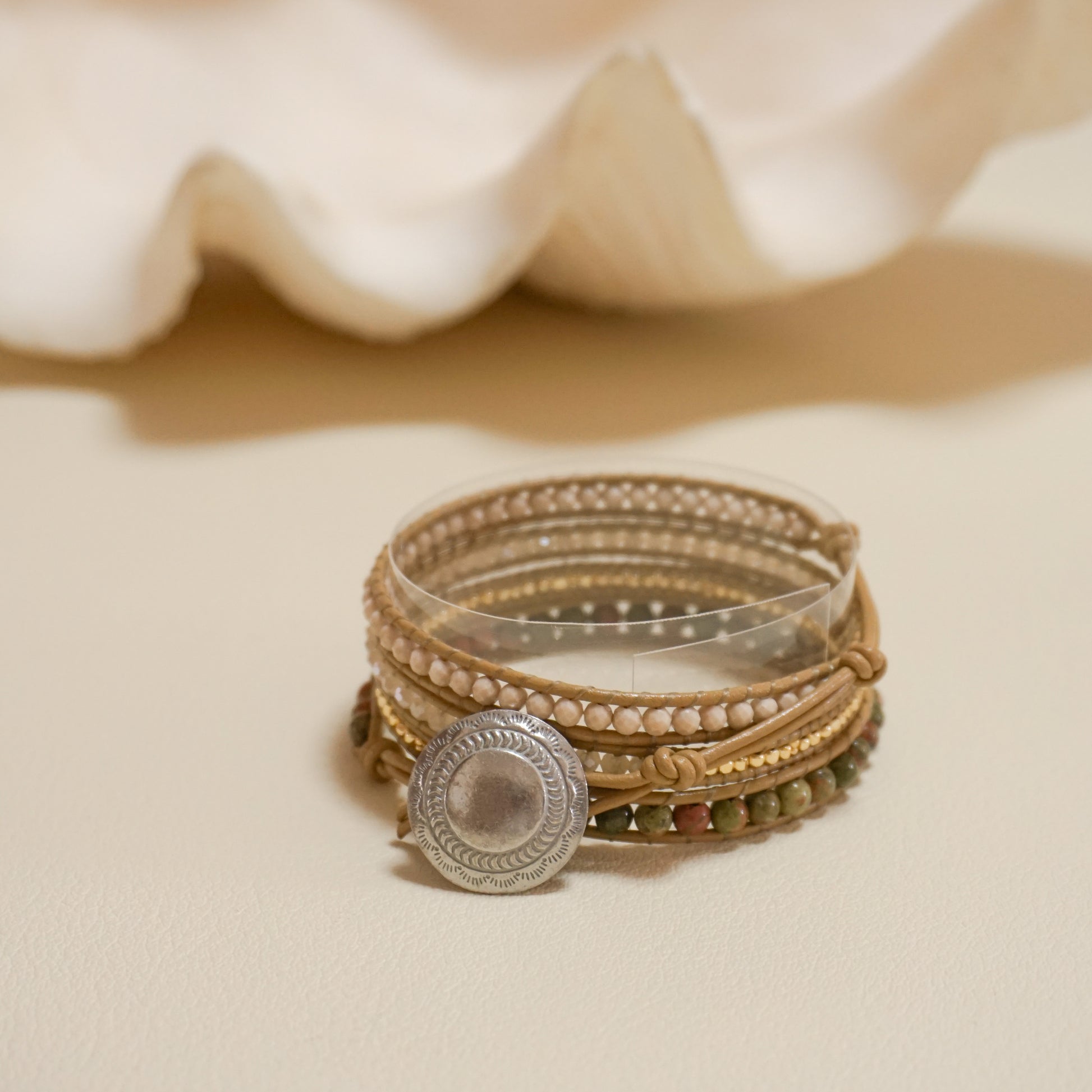 ユナカイト、リバーストーン、メタルビーズ、バフレザーコード、ニッケルボタン