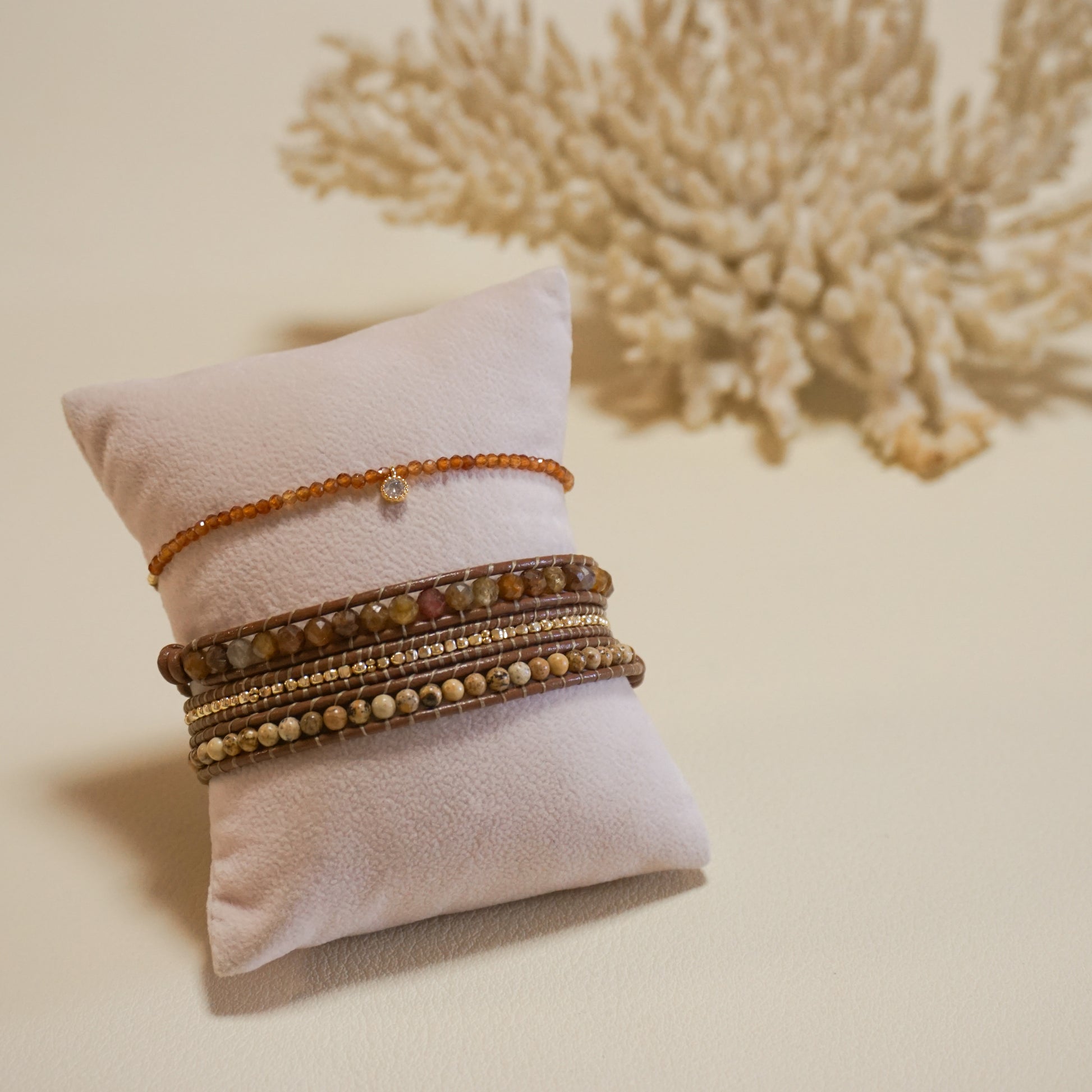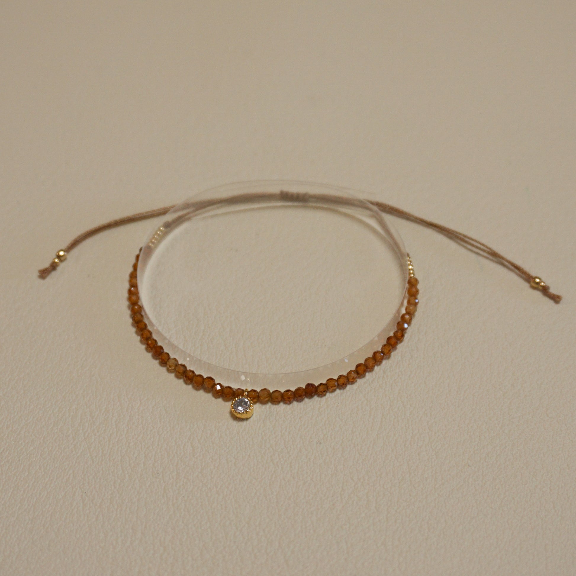 オレンジガーネット、真鍮キュービックジルコニアチャーム、ガラスビーズ、メタルビーズ、エジプト綿紐