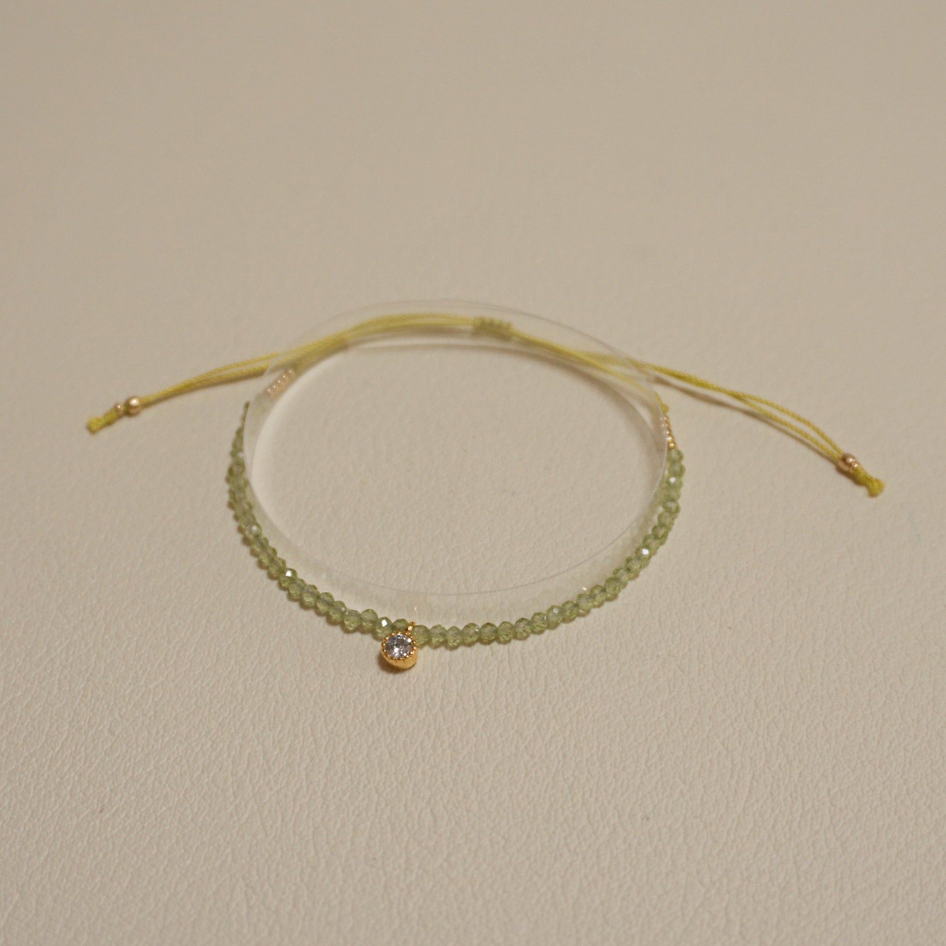 ペリドット、真鍮キュービックジルコニアチャーム、ガラスビーズ、メタルビーズ、エジプト綿紐