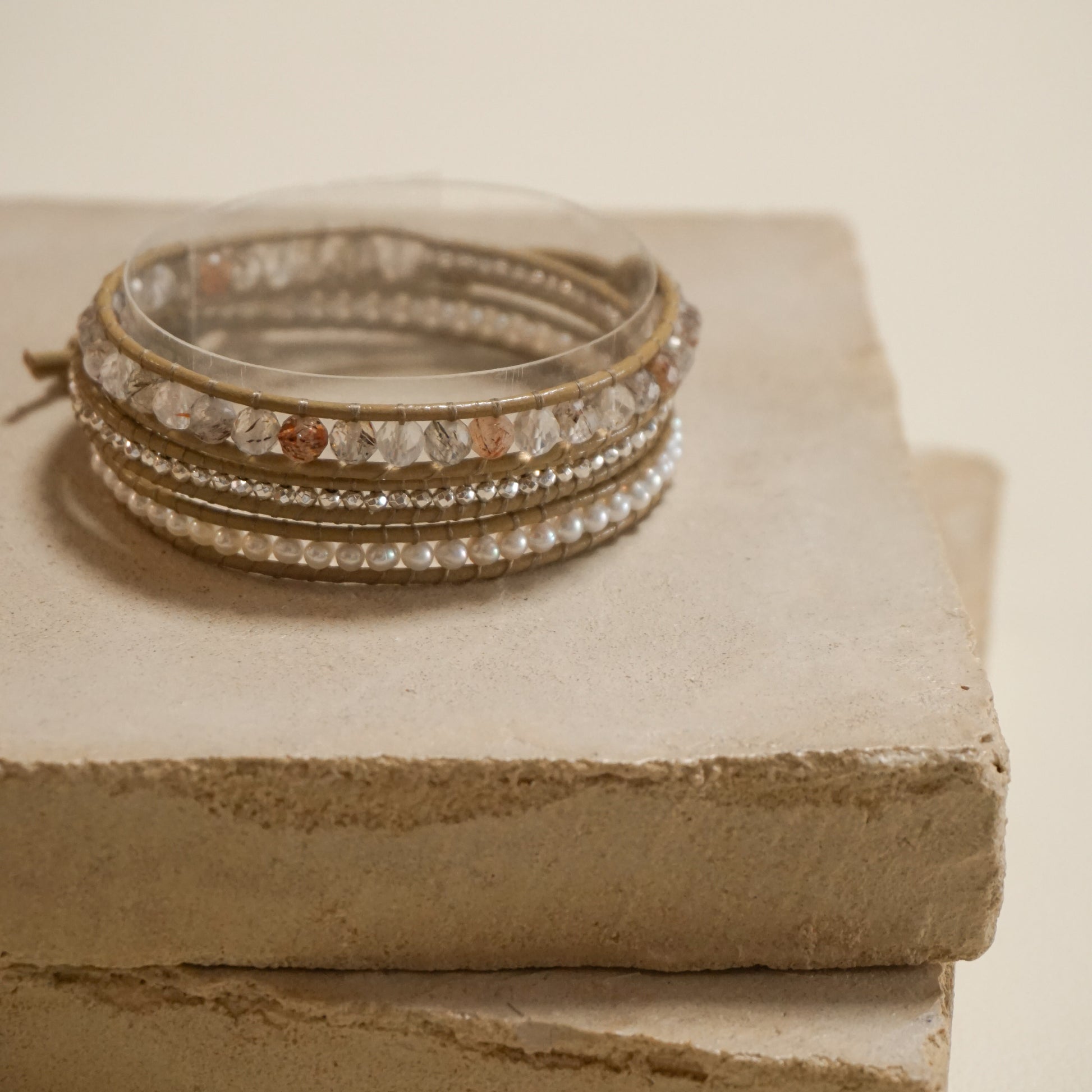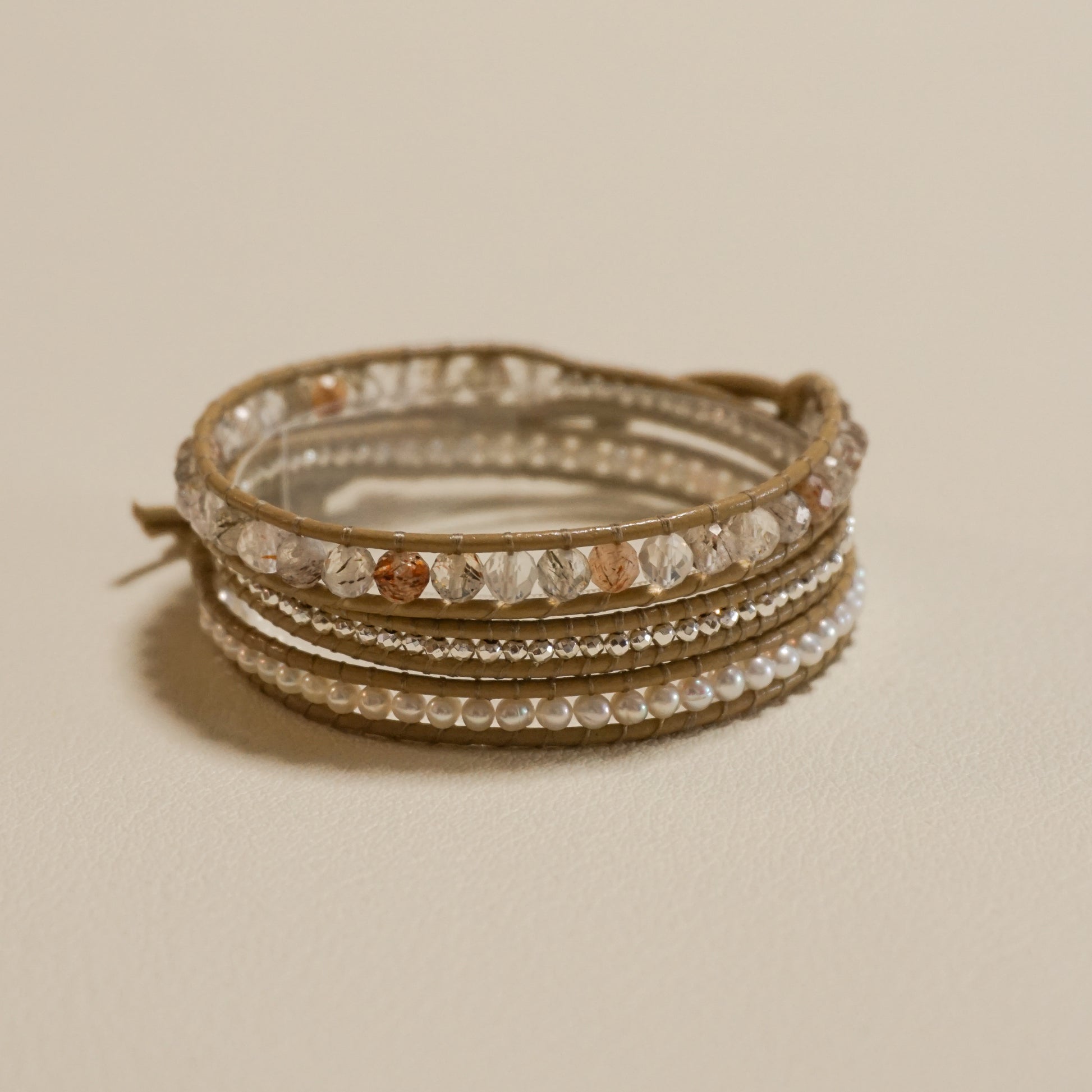 コッパールチルクォーツ、パイライト、淡水真珠、バフレザーコード、ステンレスボタン