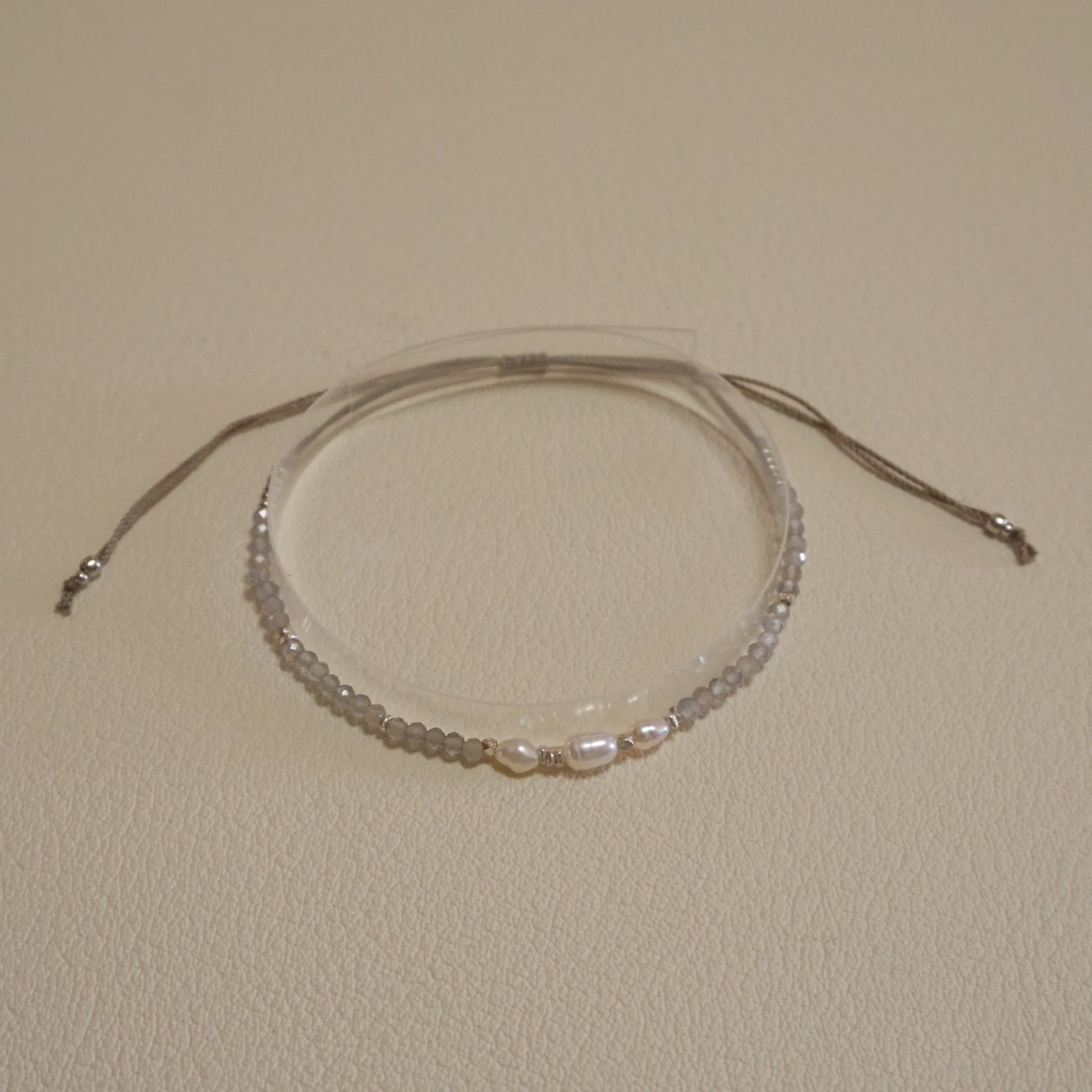 グレームーンストーン、淡水真珠、カレンシルバー、メタルビーズ、エジプト綿紐
