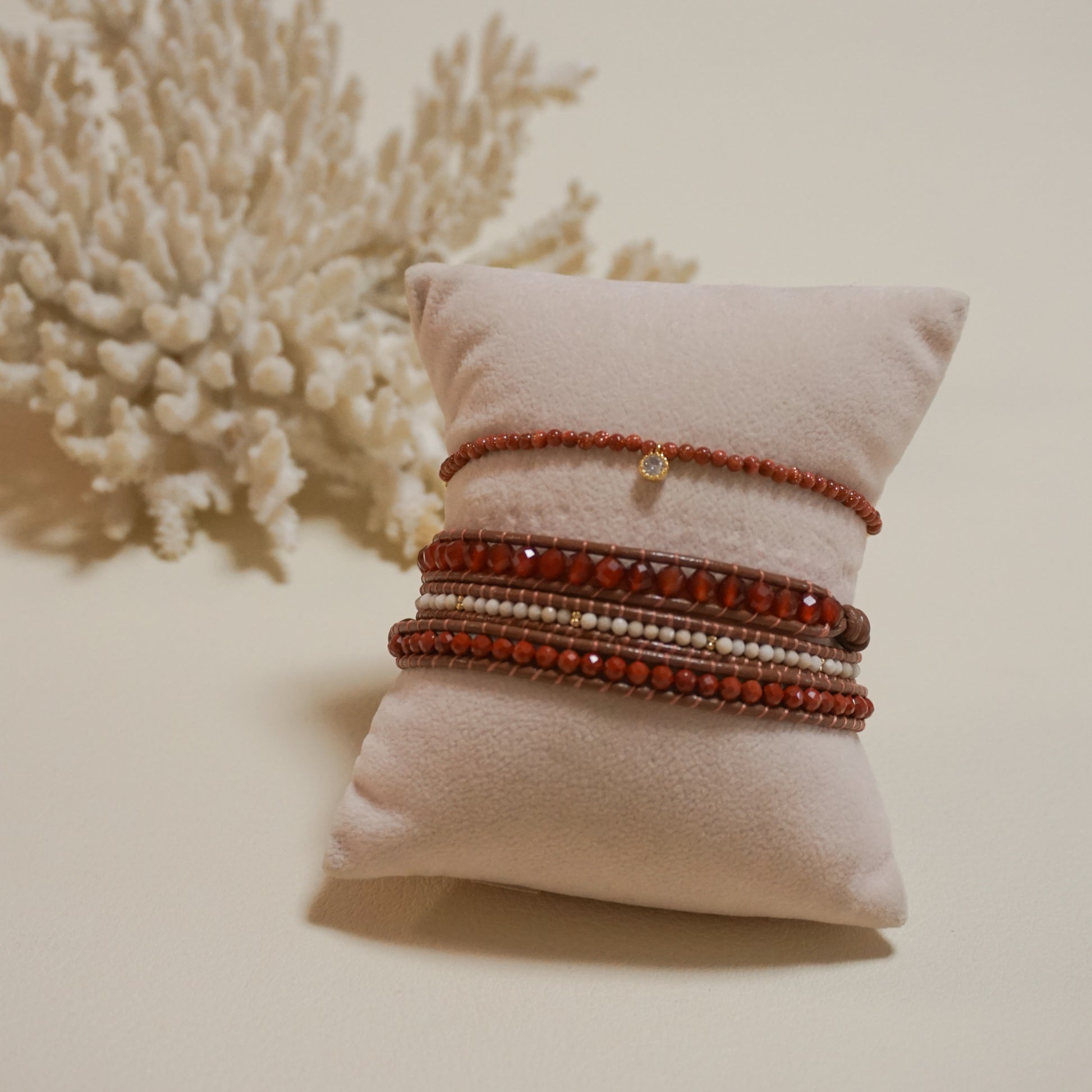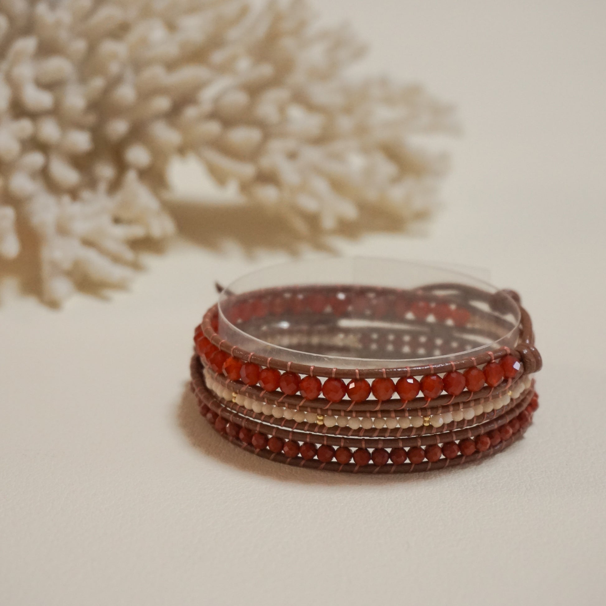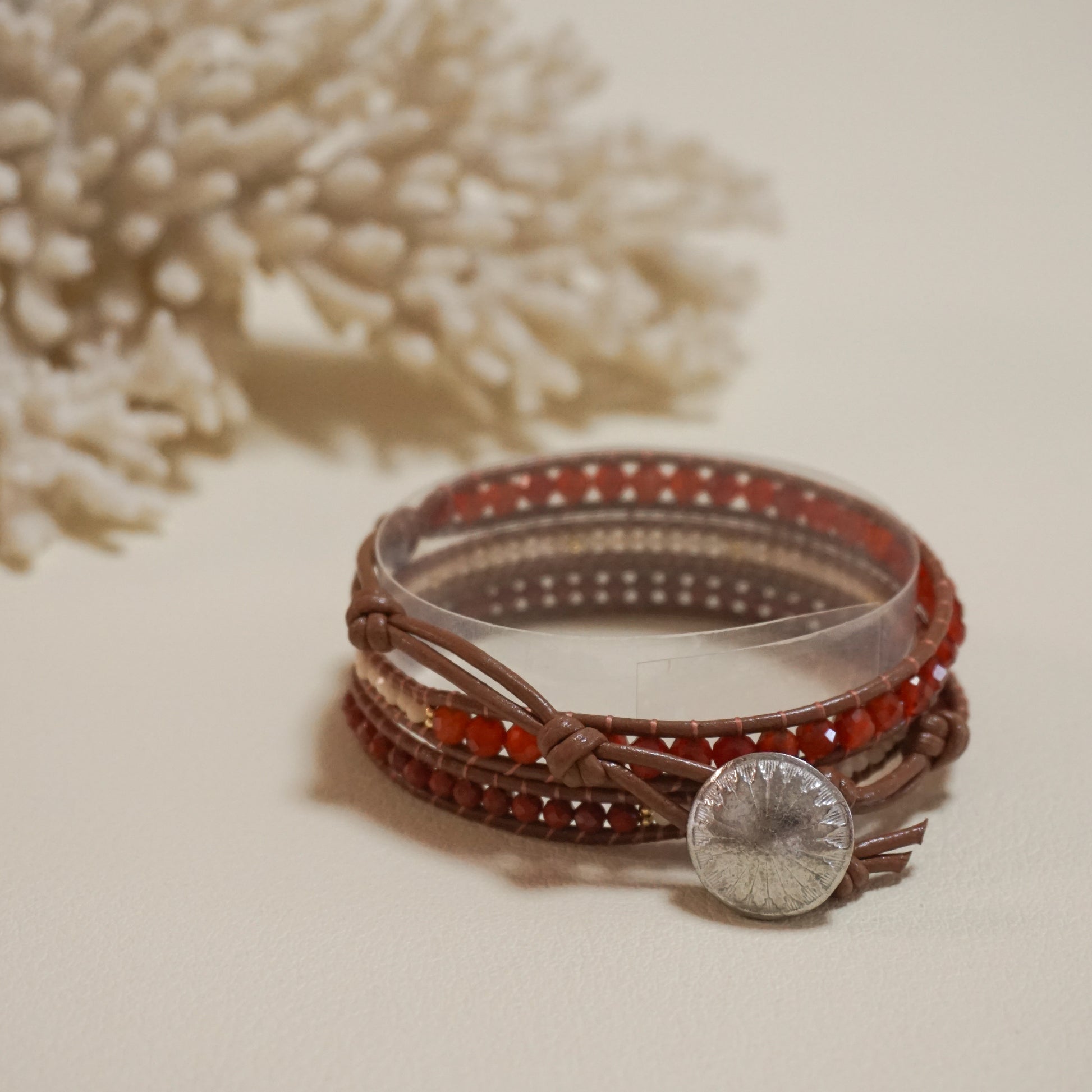 レッドアゲート、リバーストーン、レッドジャスパー、ガラスビーズ、メタルビーズ、バフレザーコード、ニッケルボタン