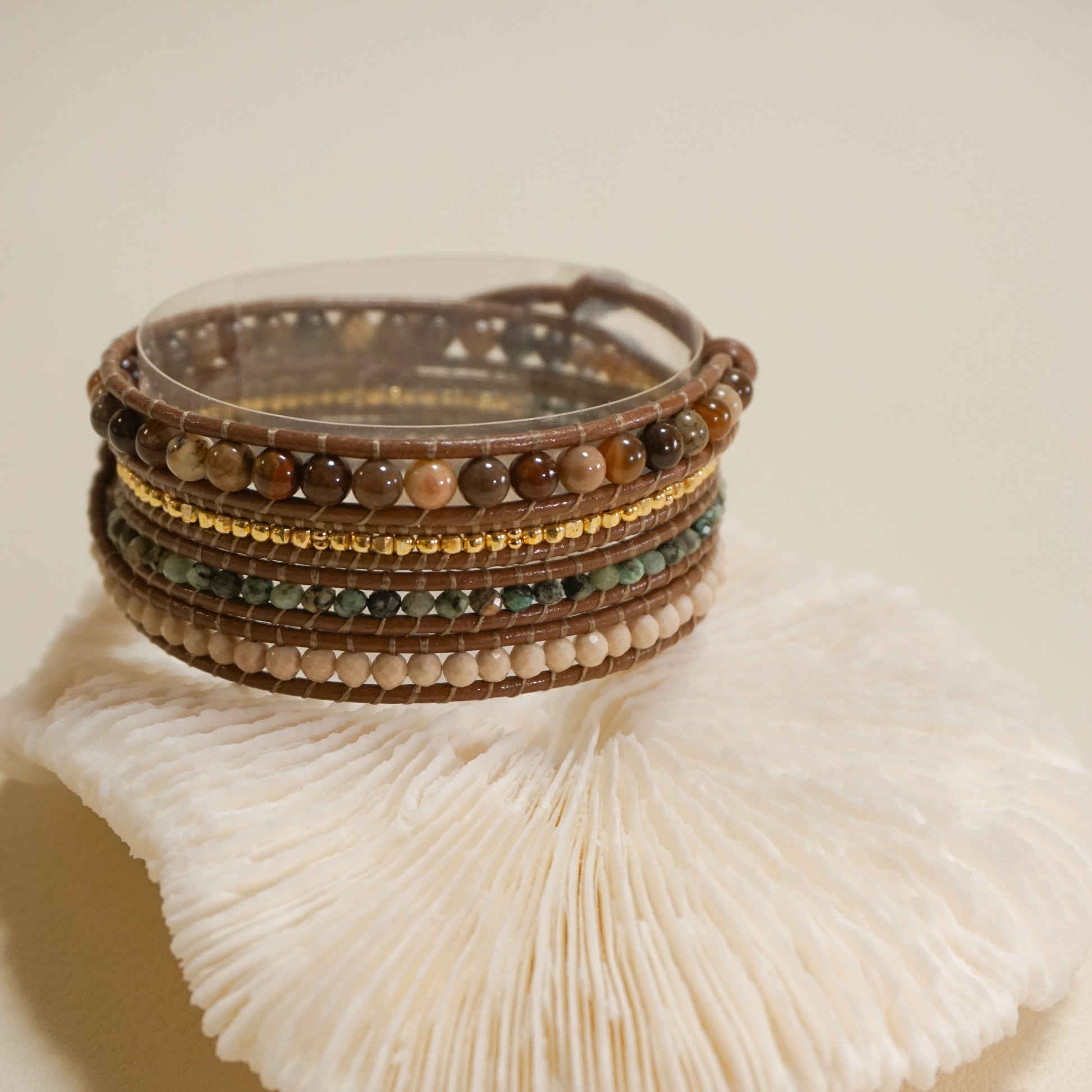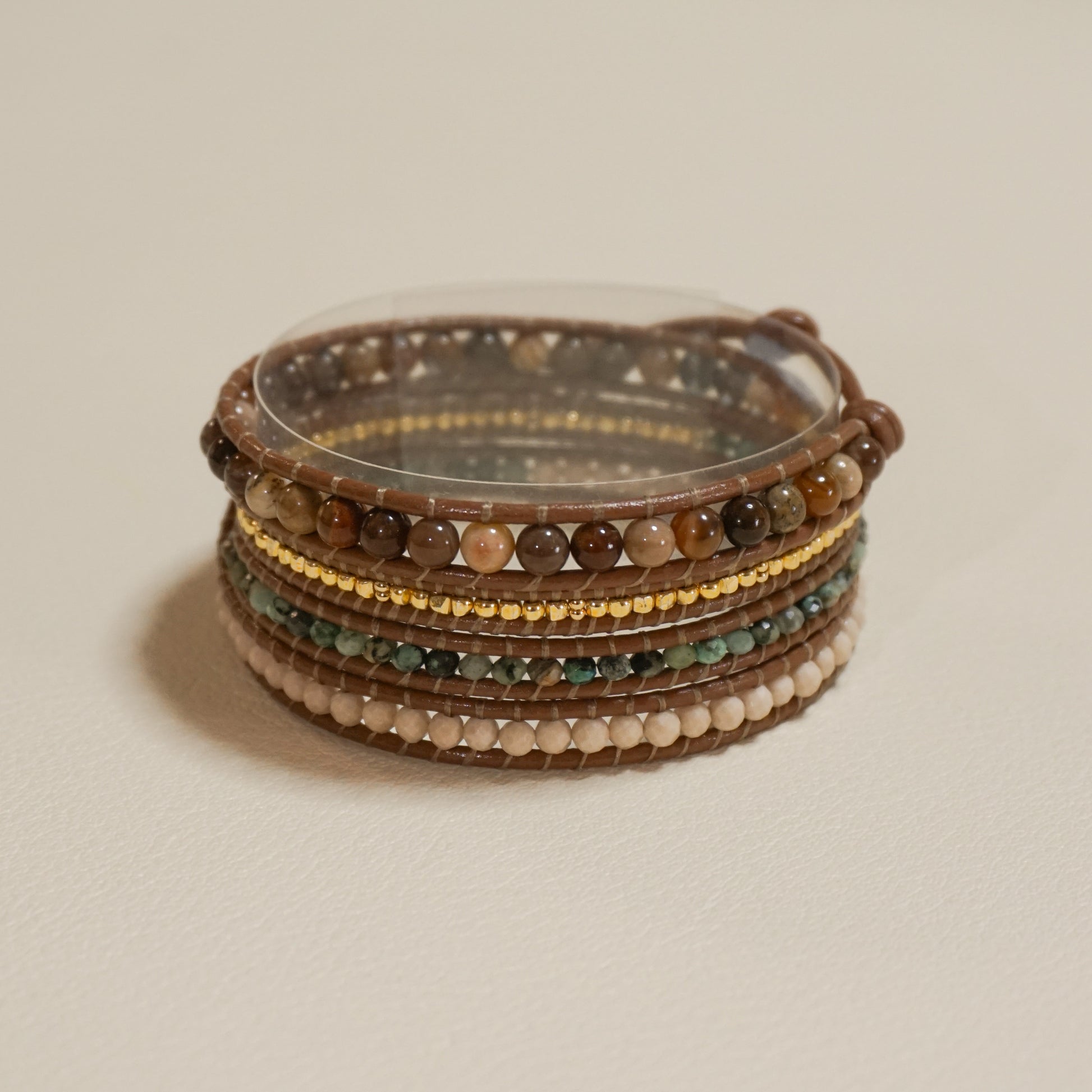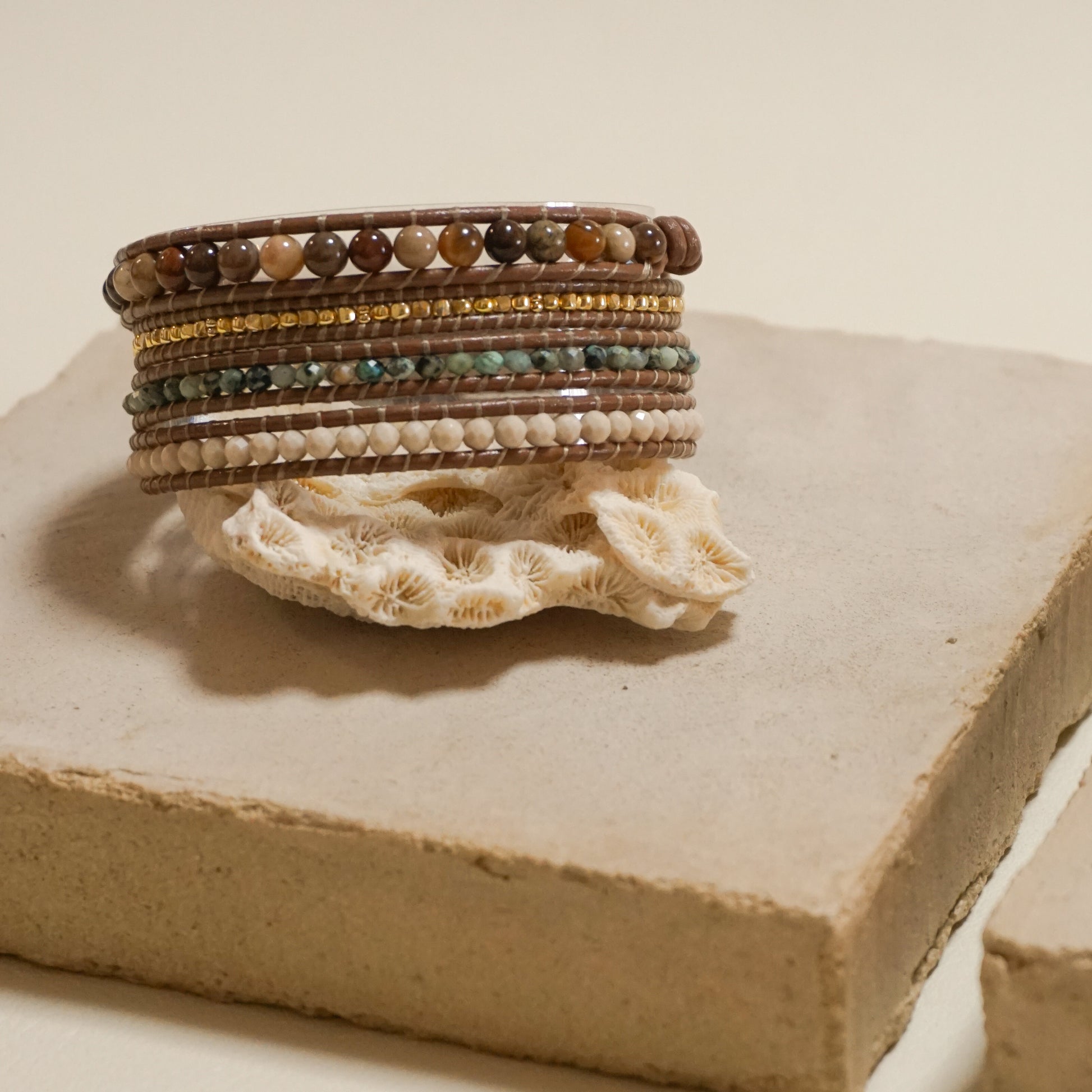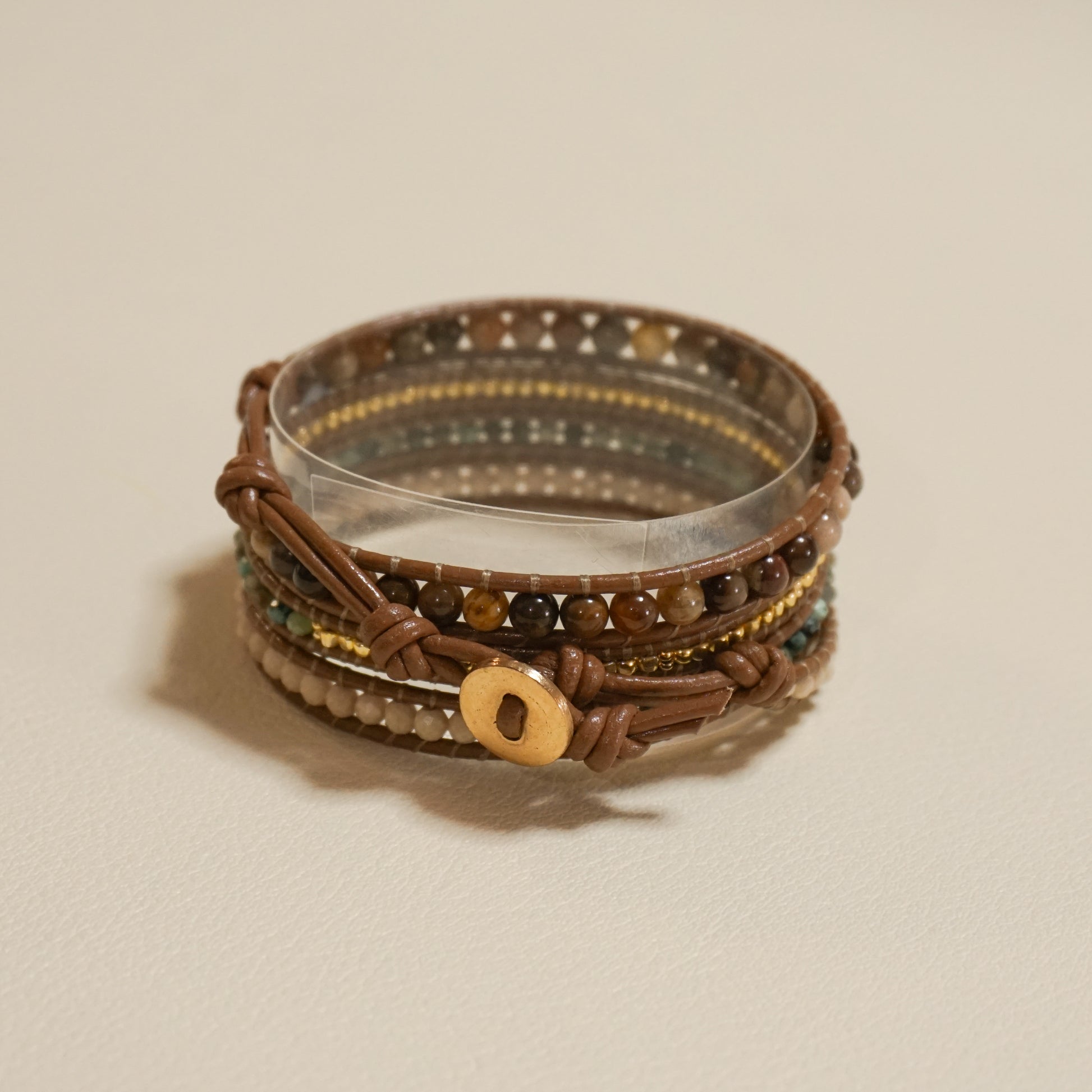 ペトリファイドウッド、ターコイズ、リバーストーン、バフレザーコード、合金ボタン