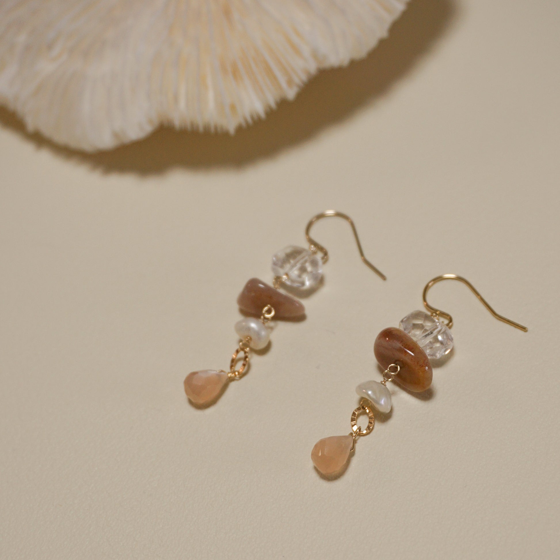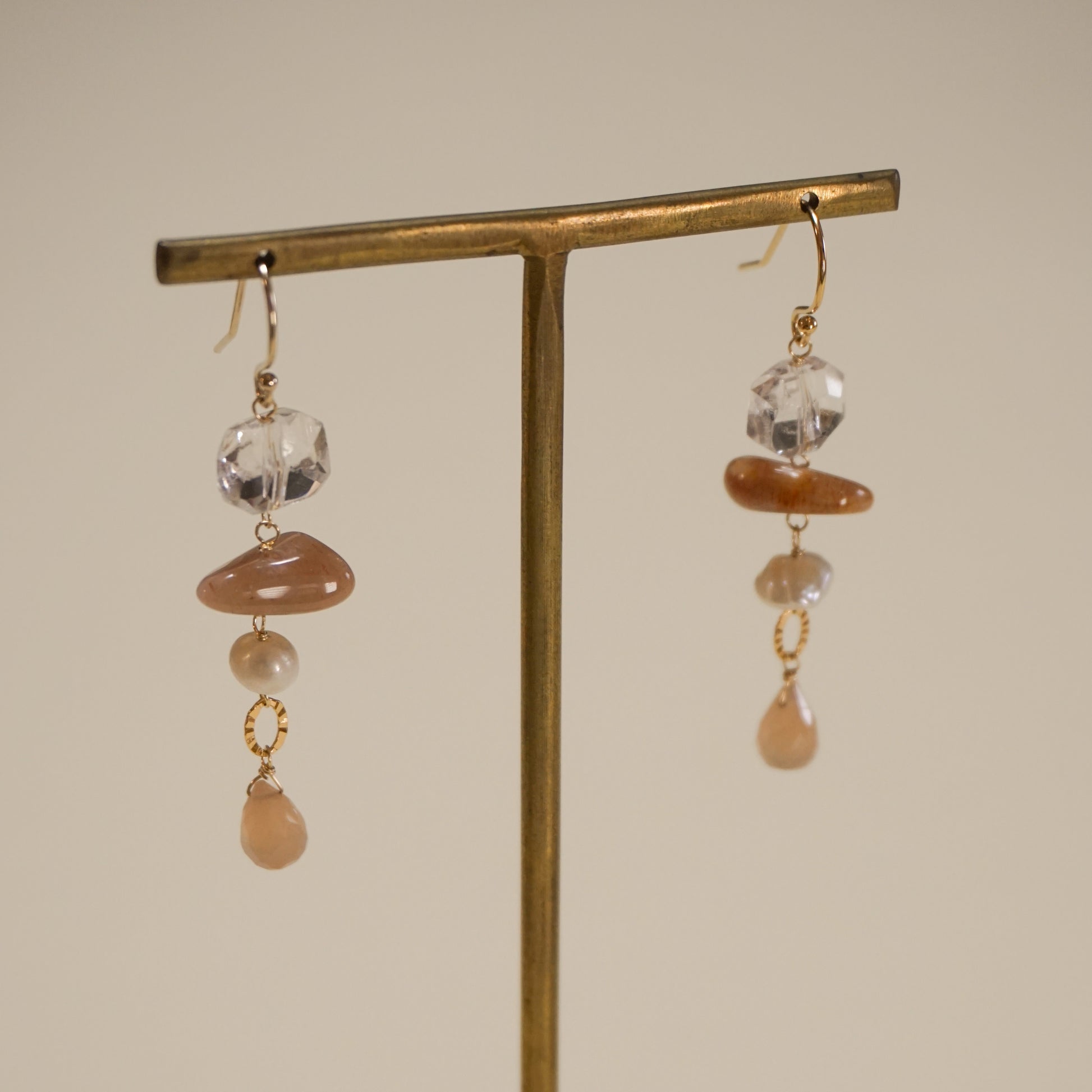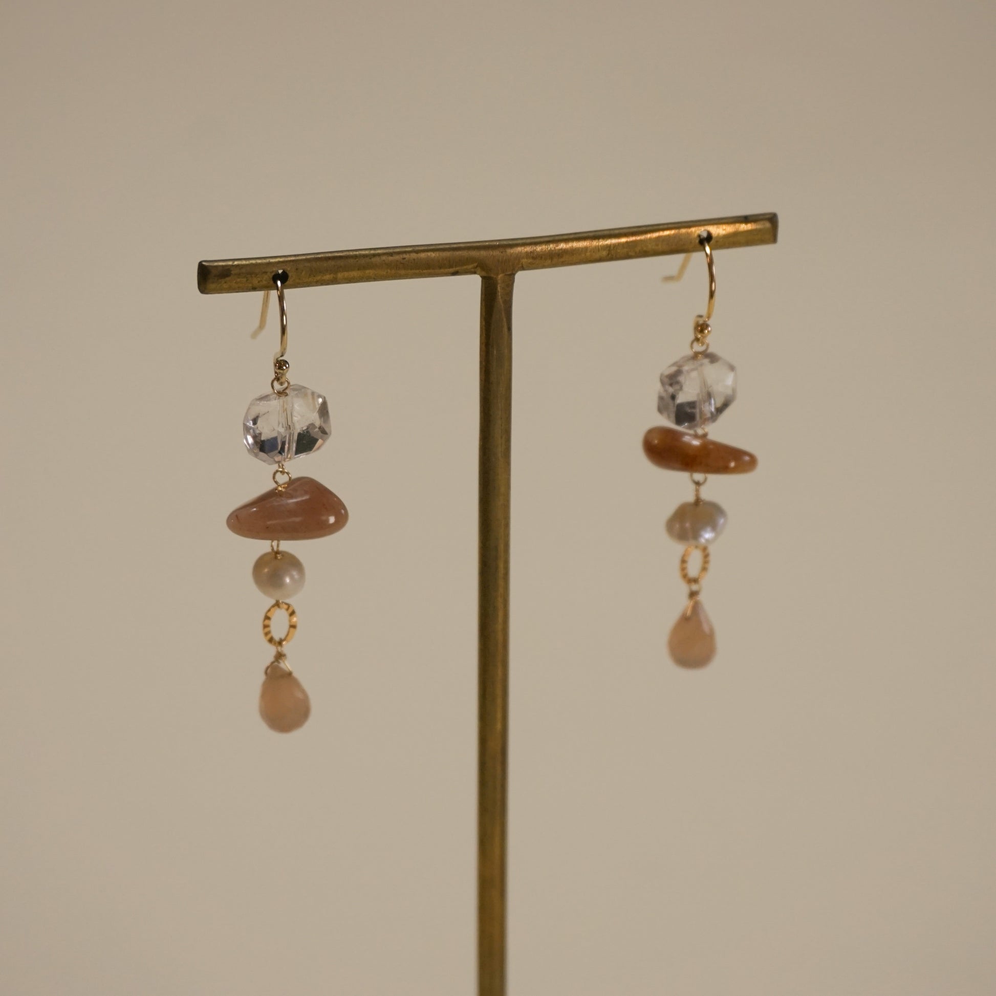 クリスタル、ブラウンムーンストーン、淡水真珠、オレンジムーンストーン、14kgf
