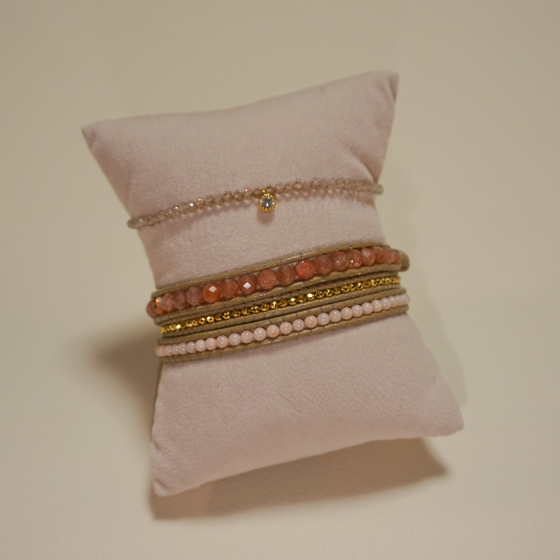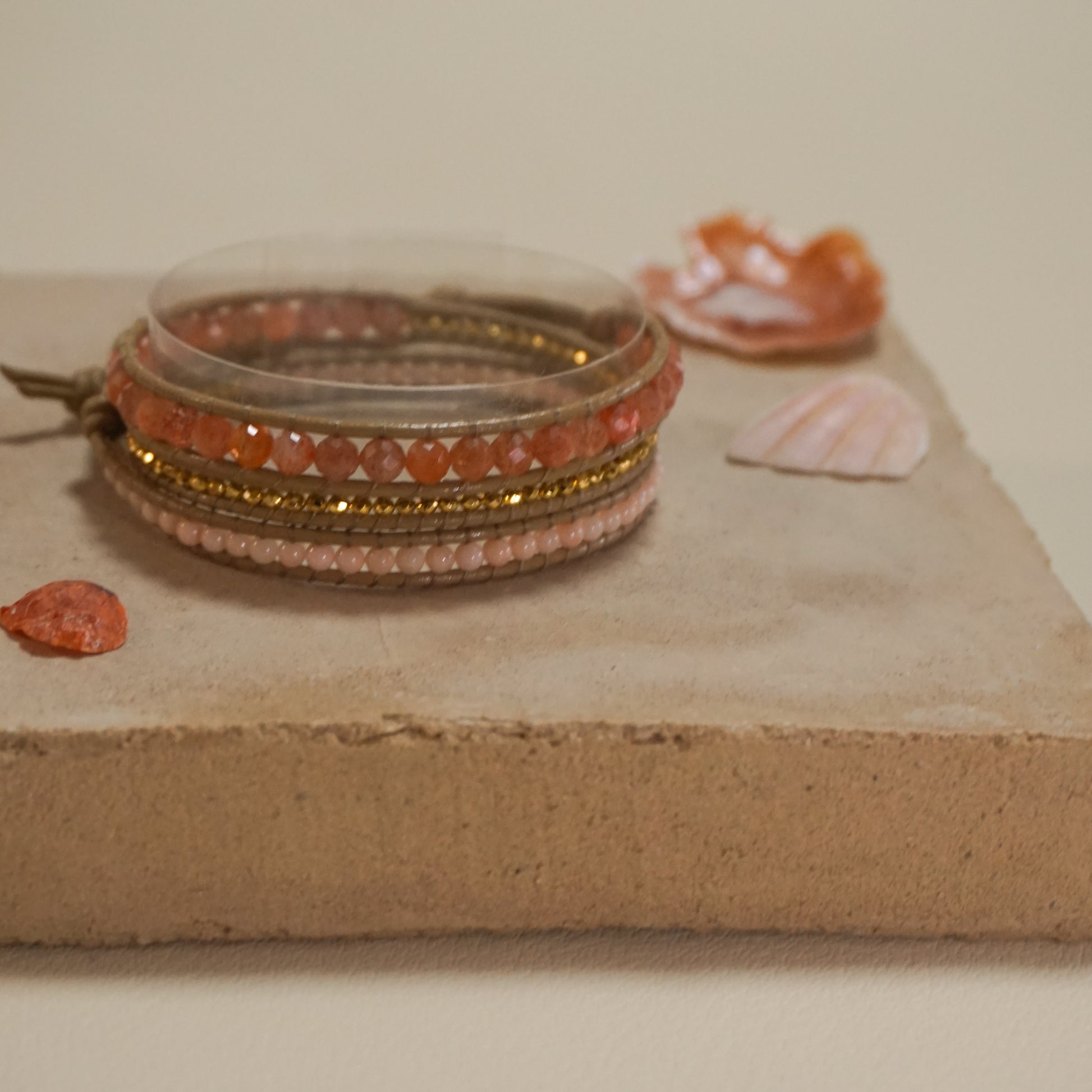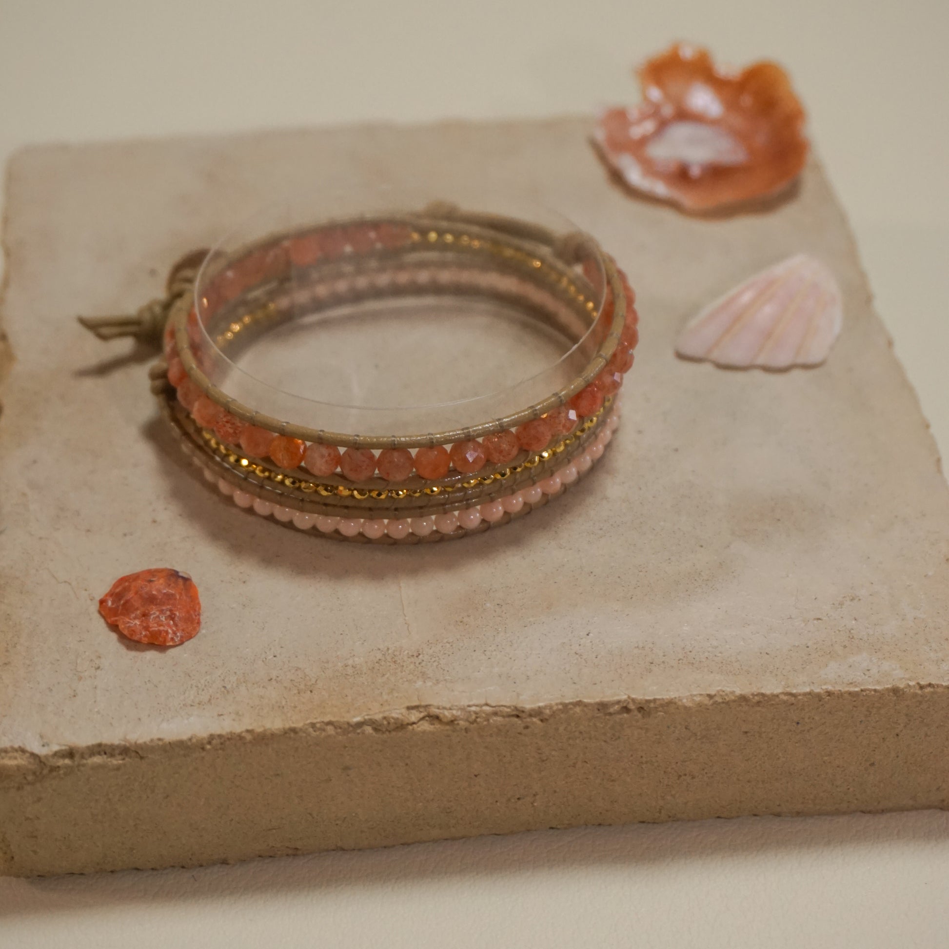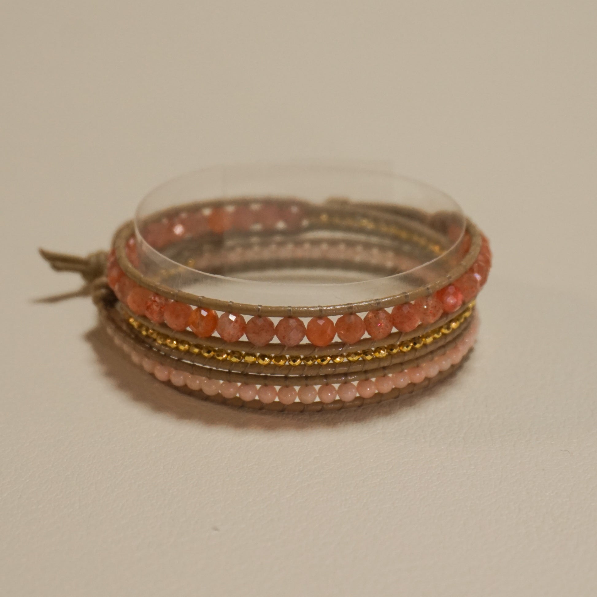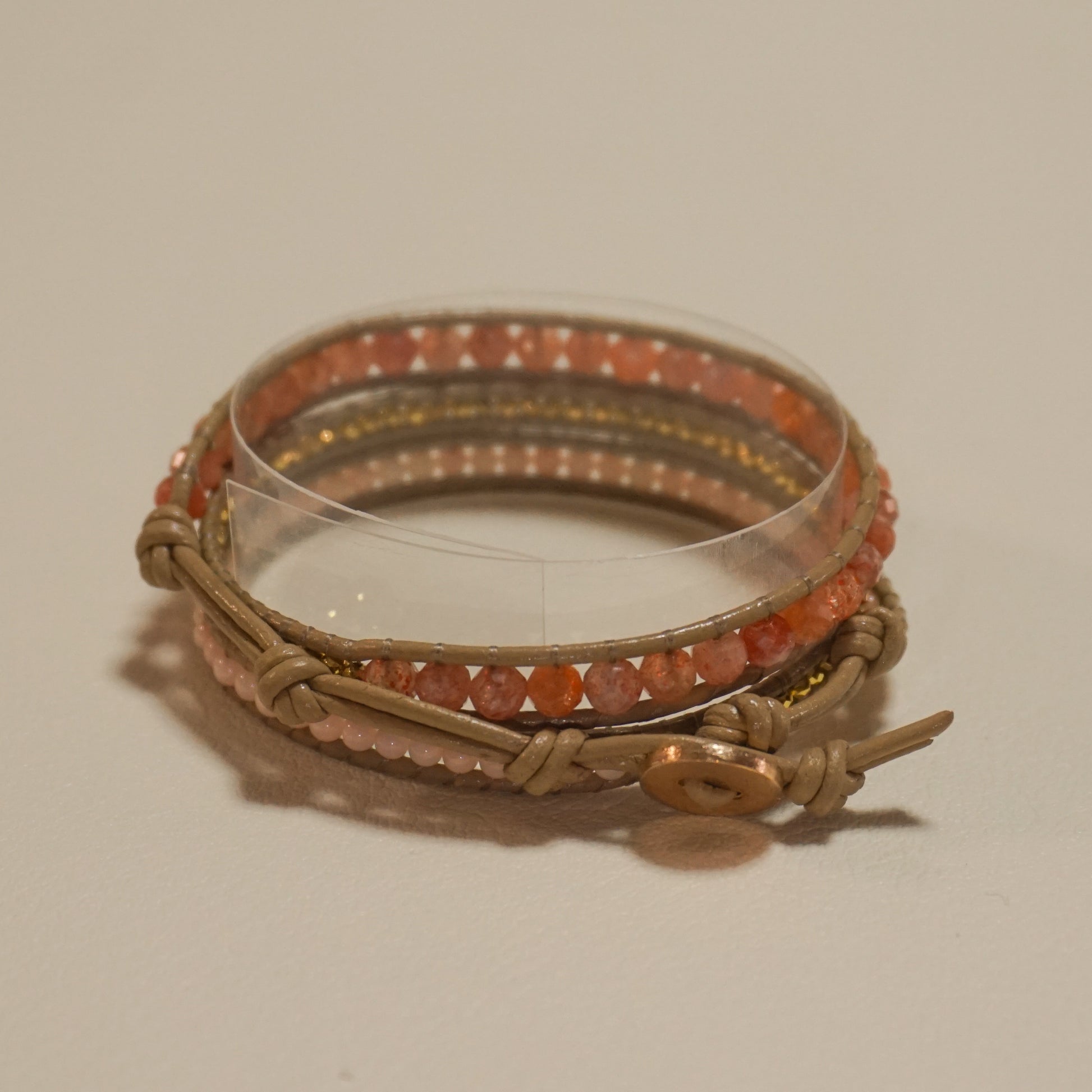 サンストーン、パイライト、ピンクコーラル、バフレザーコード、ステンレスボタン