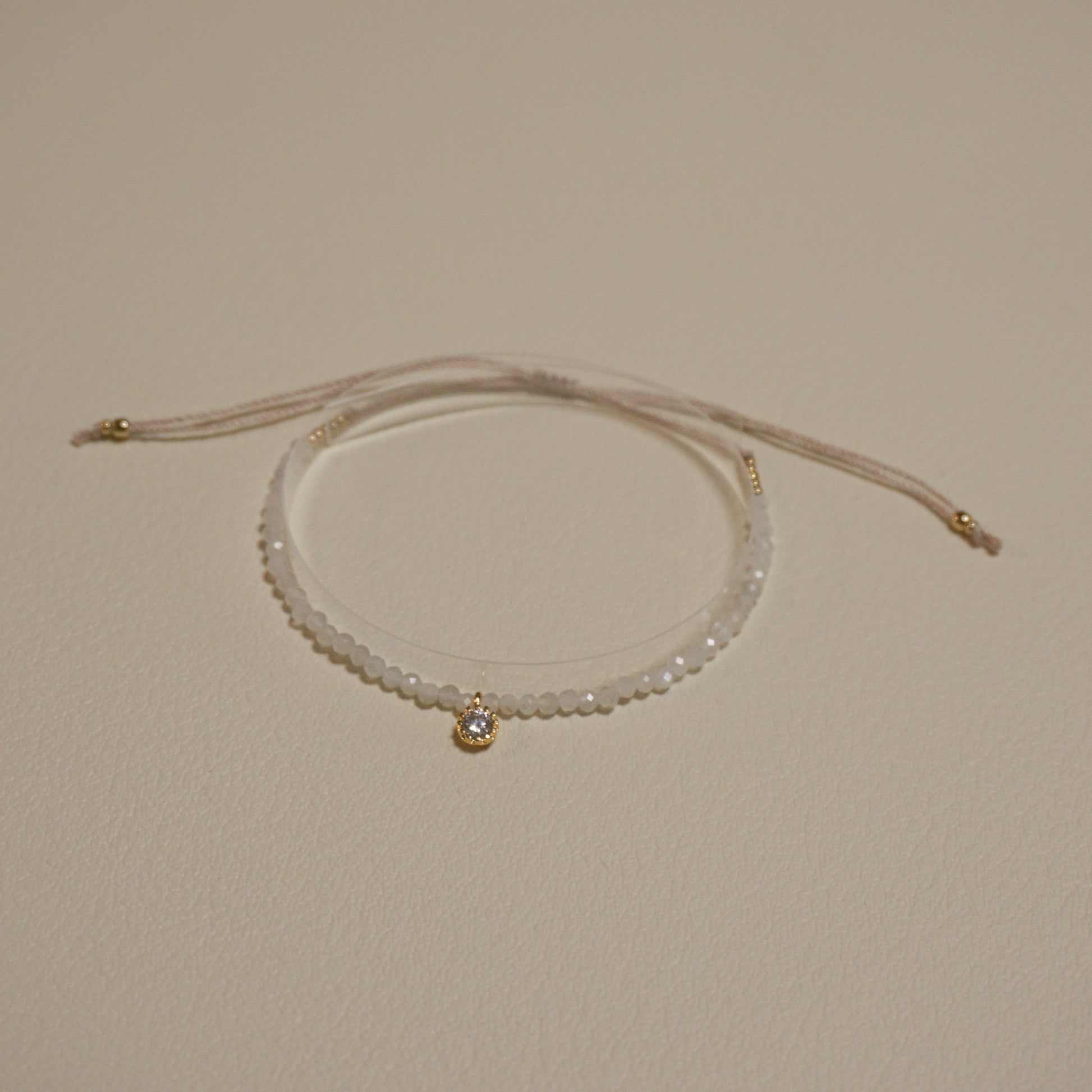 ホワイトムーンストーン、真鍮キュービックジルコニアチャーム、ガラスビーズ、メタルビーズ、エジプト綿紐