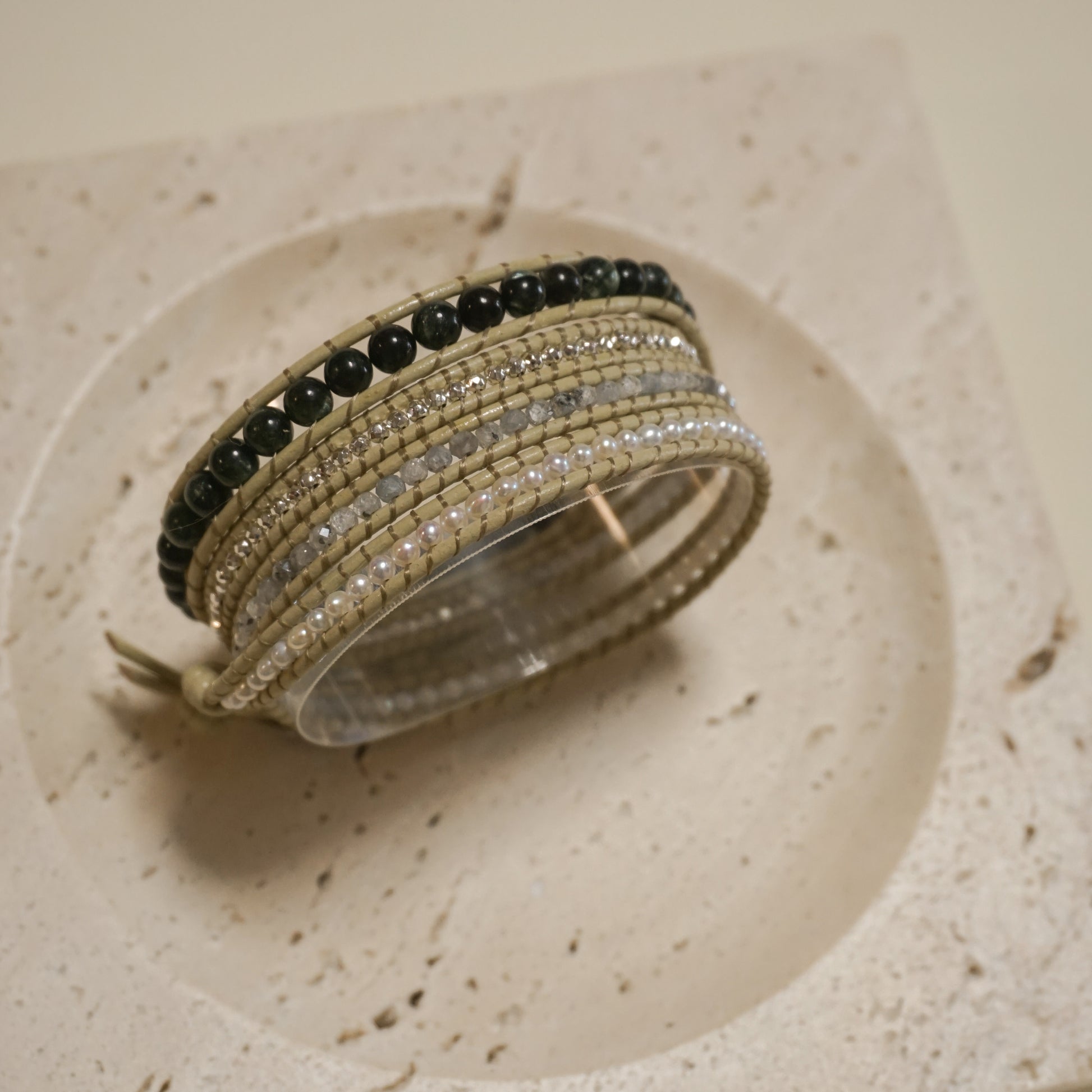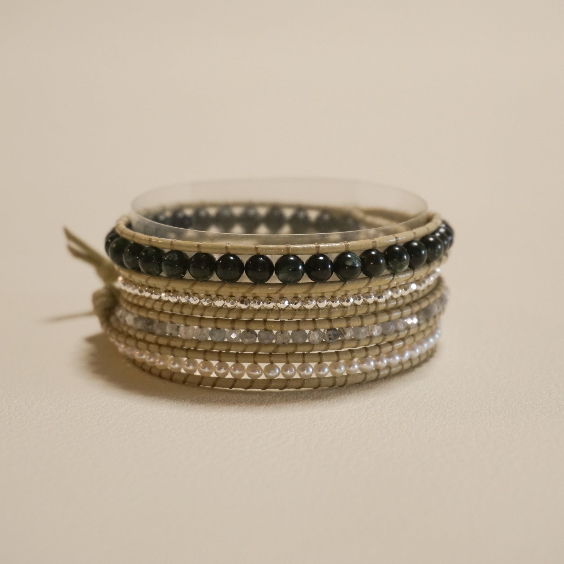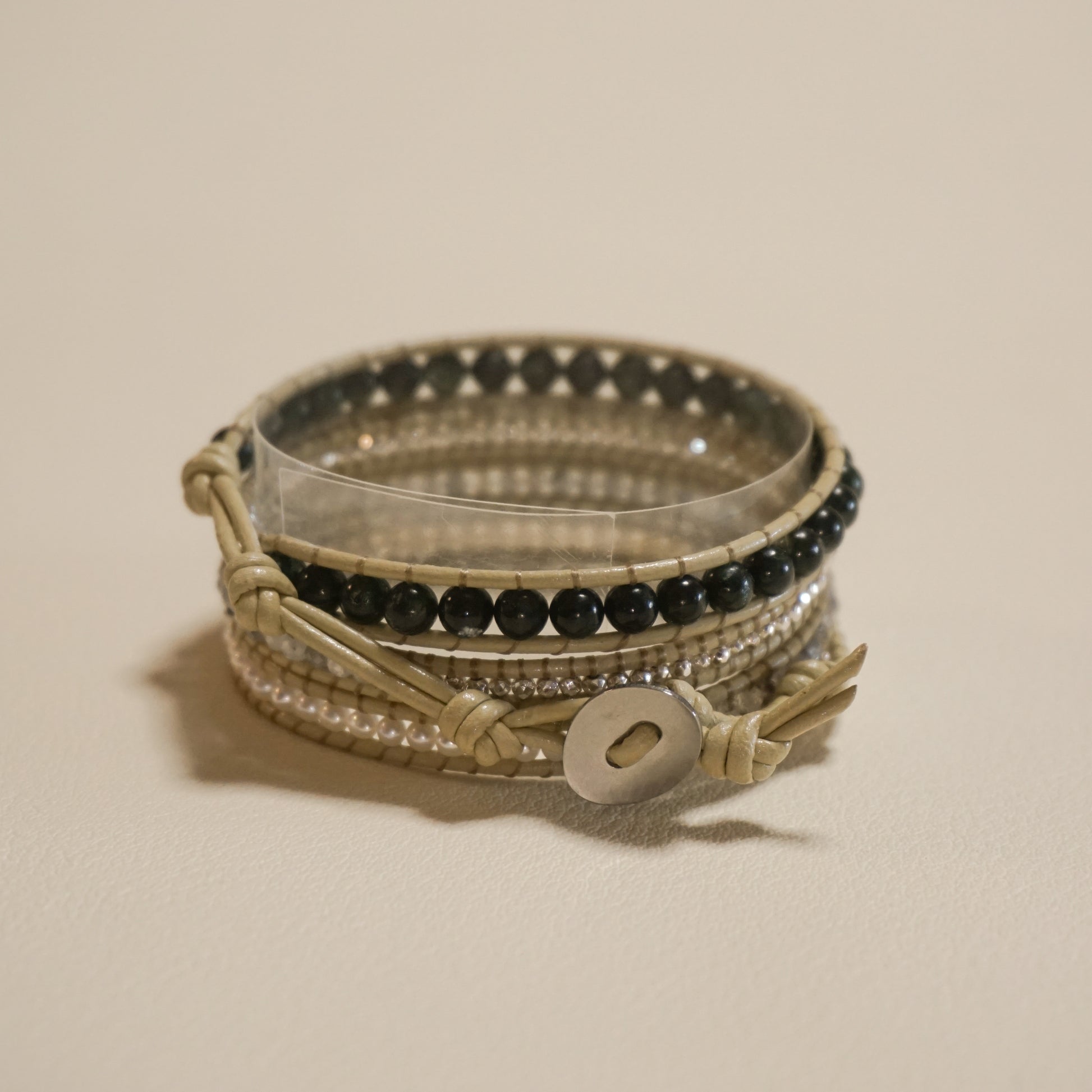 セラフィナイト、パイライト、ライトグレージルコン、淡水真珠、バフレザーコード、ステンレスボタン