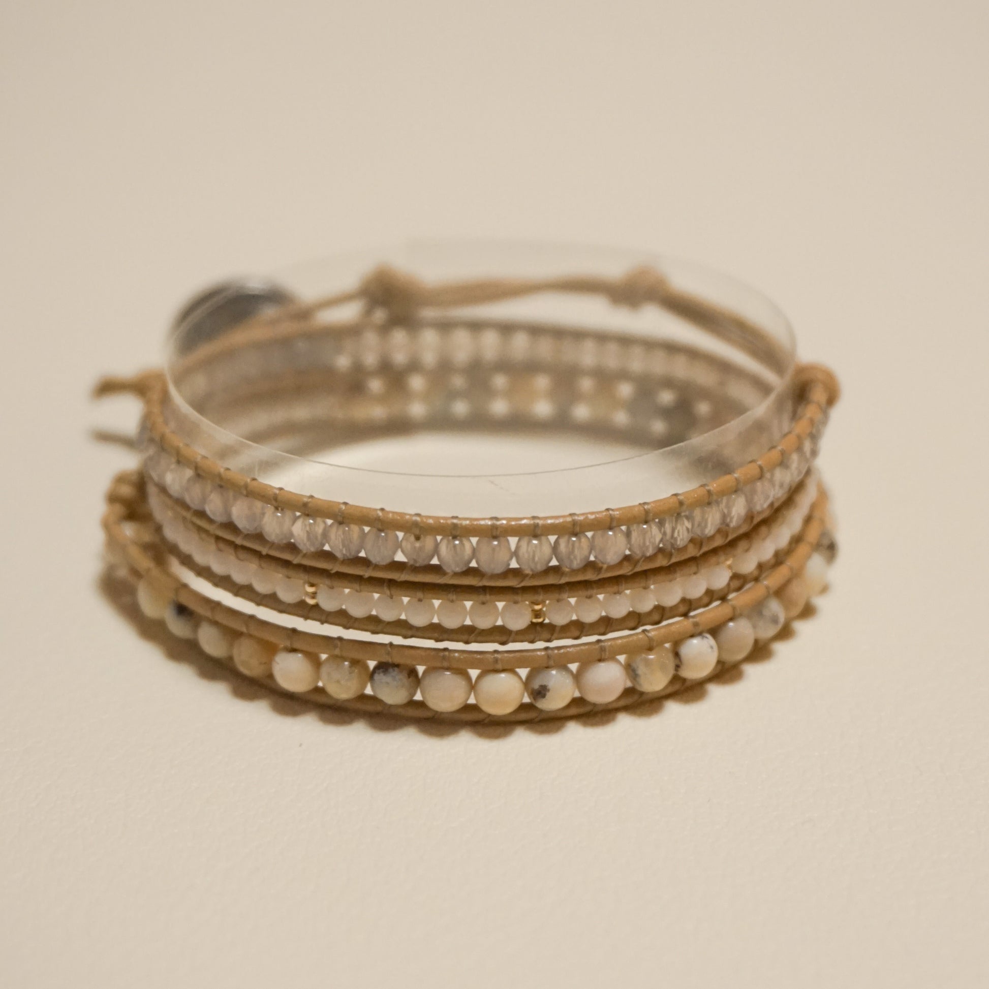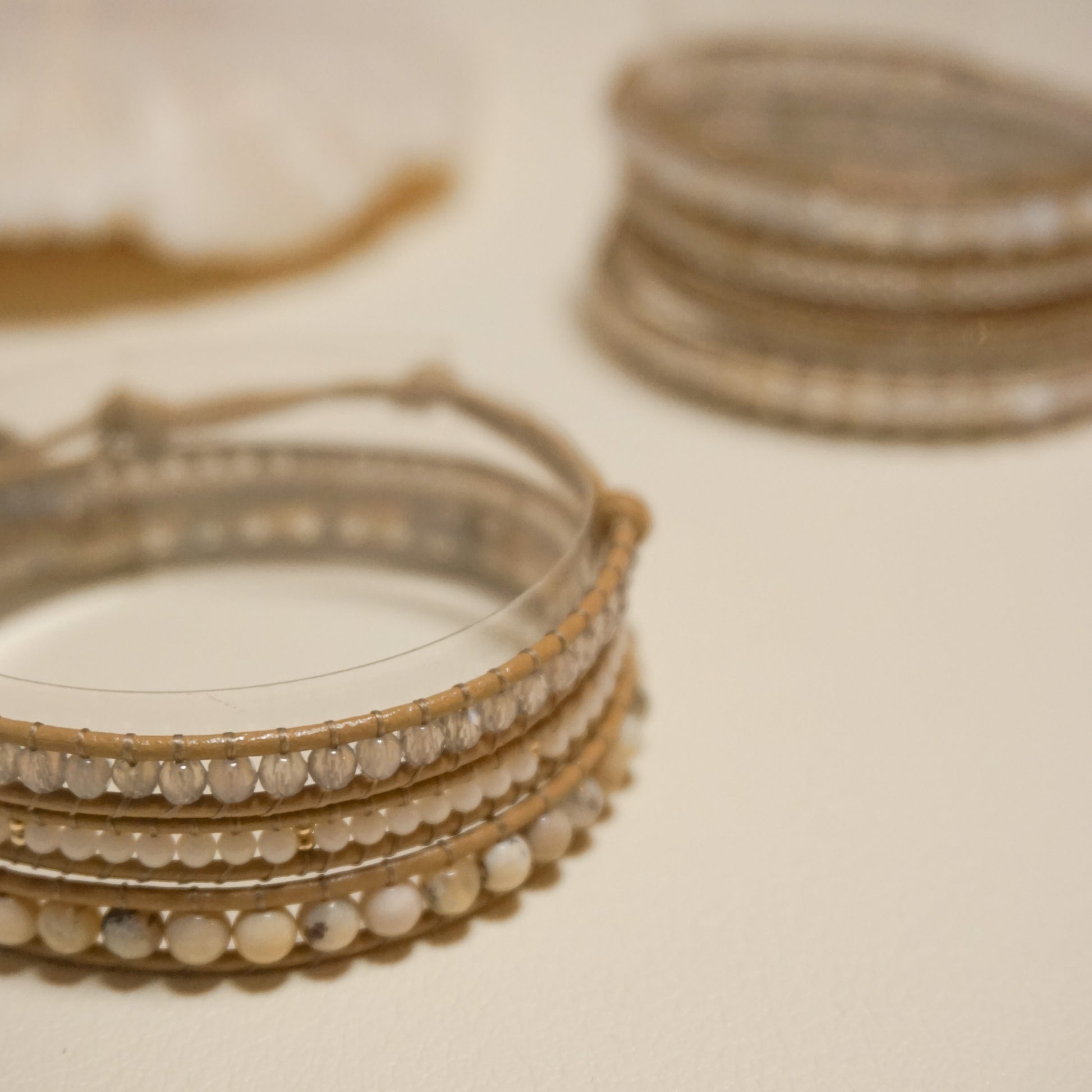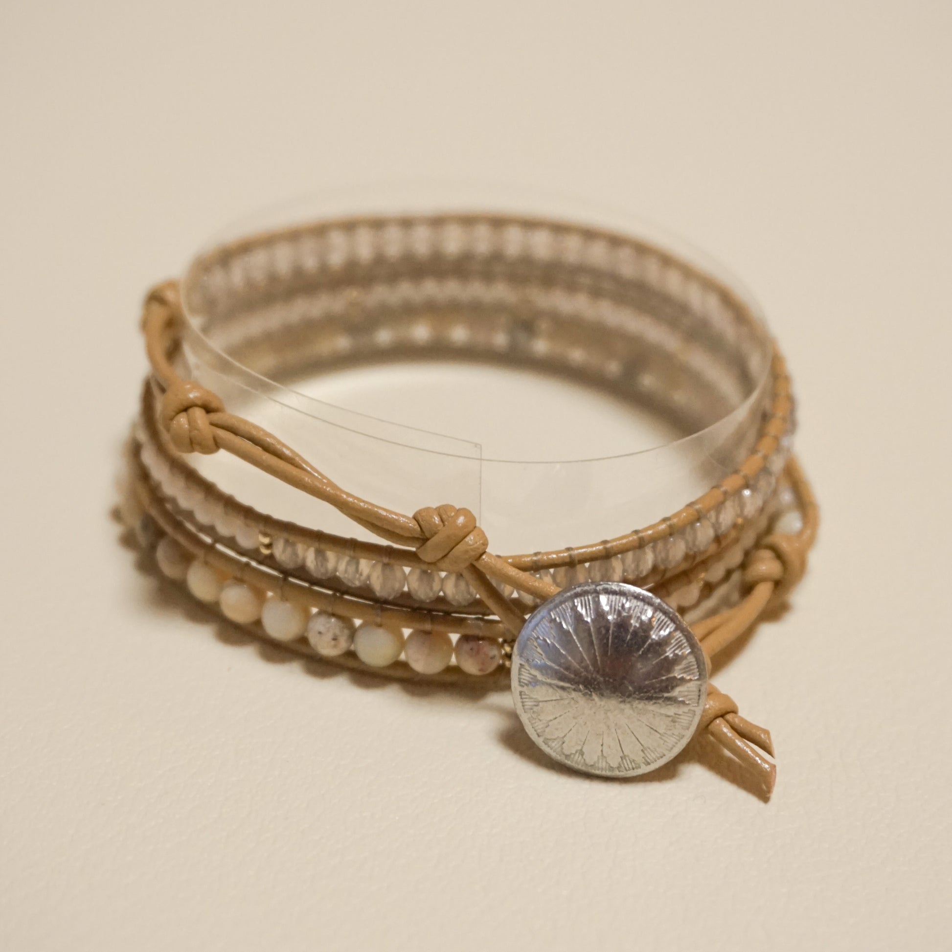 アフリカンオパール、白珊瑚、グレーオニキス、メタルビーズ、バフレザーコード、ニッケルボタン