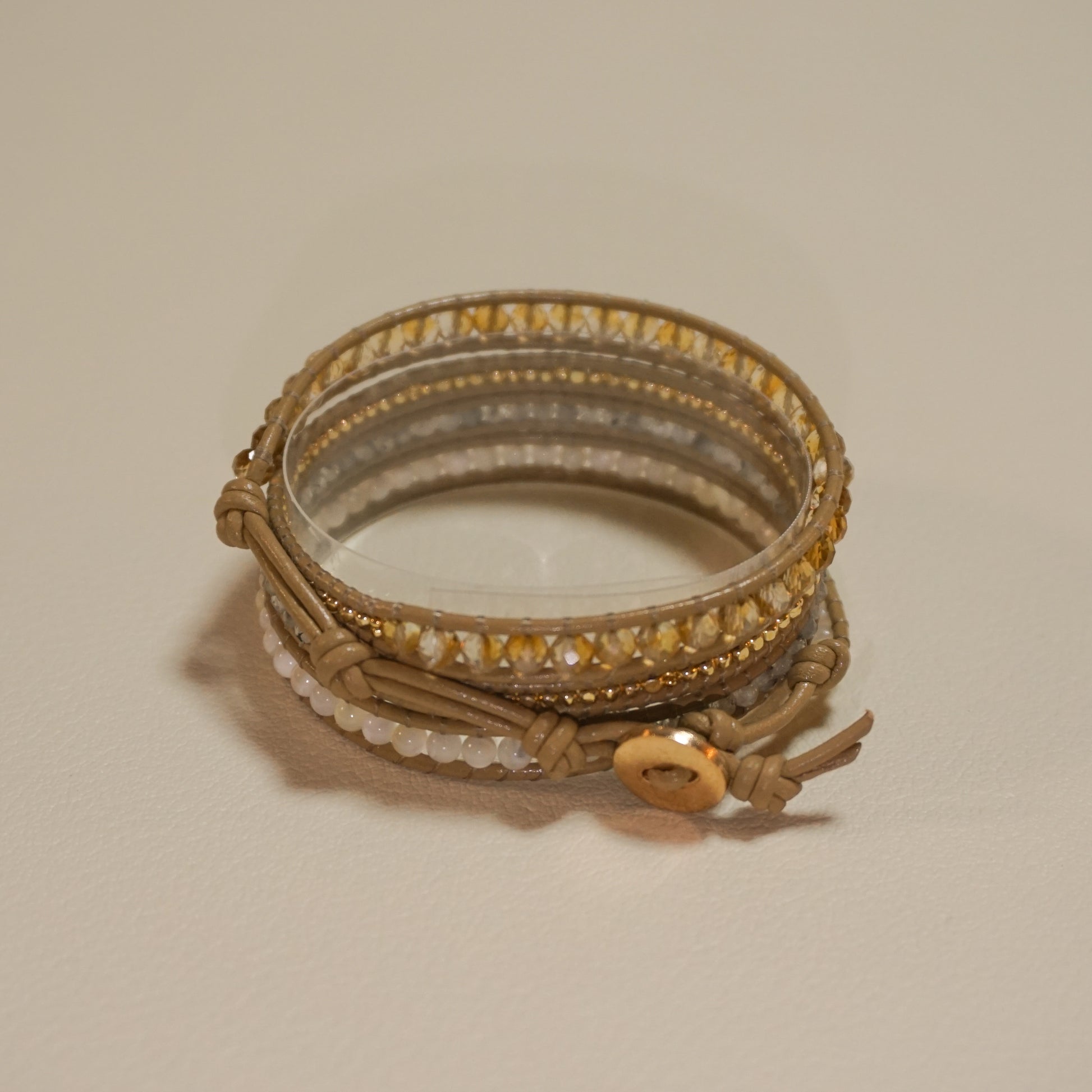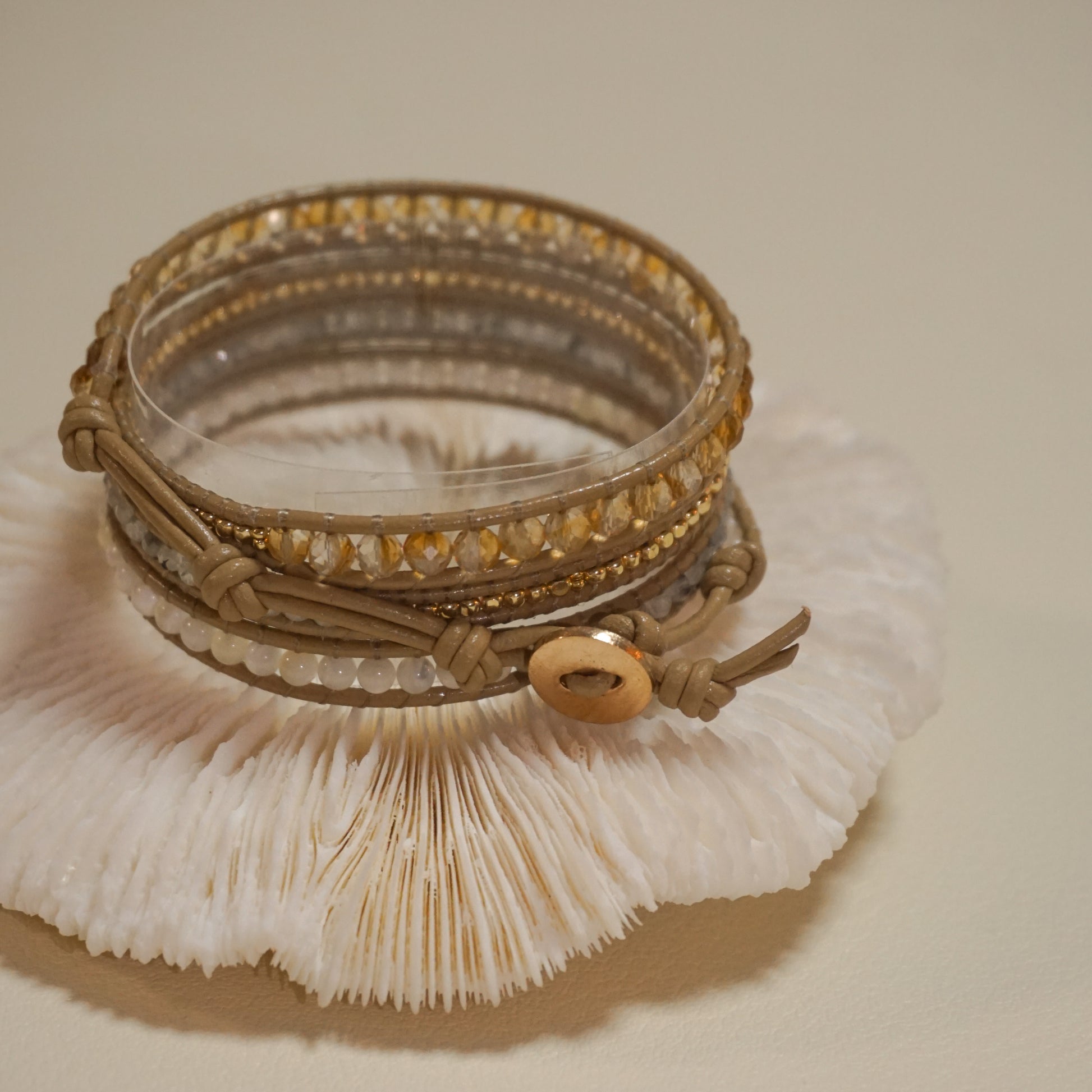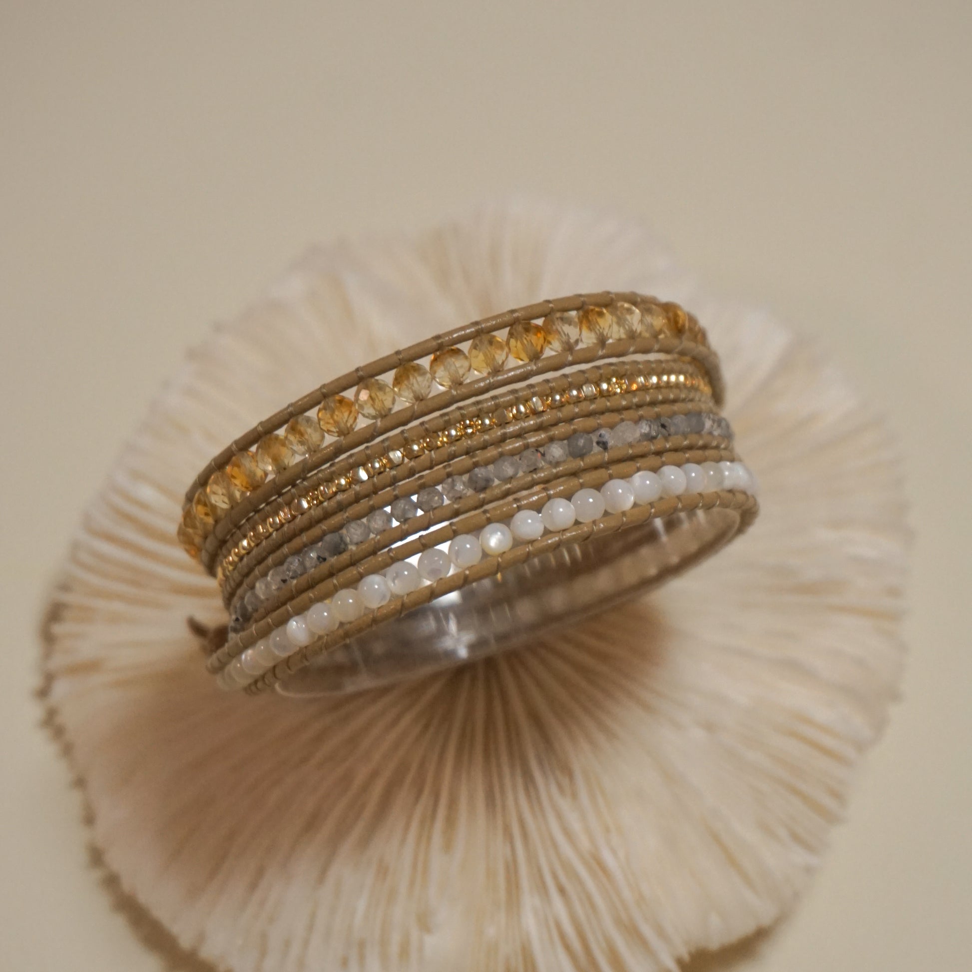 シトリン、ジルコン、マザーオブパール、ガラスビーズ、メタルビーズ、バフレザーコード、合金ボタン