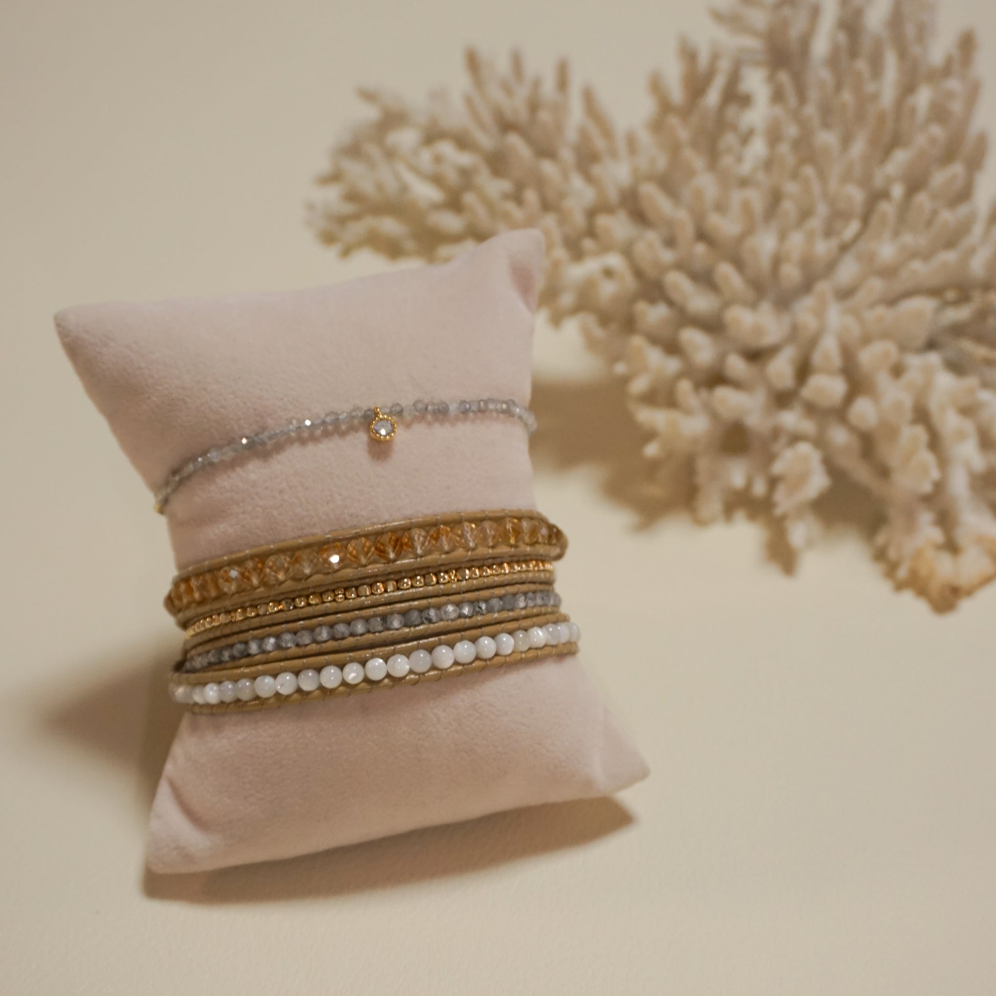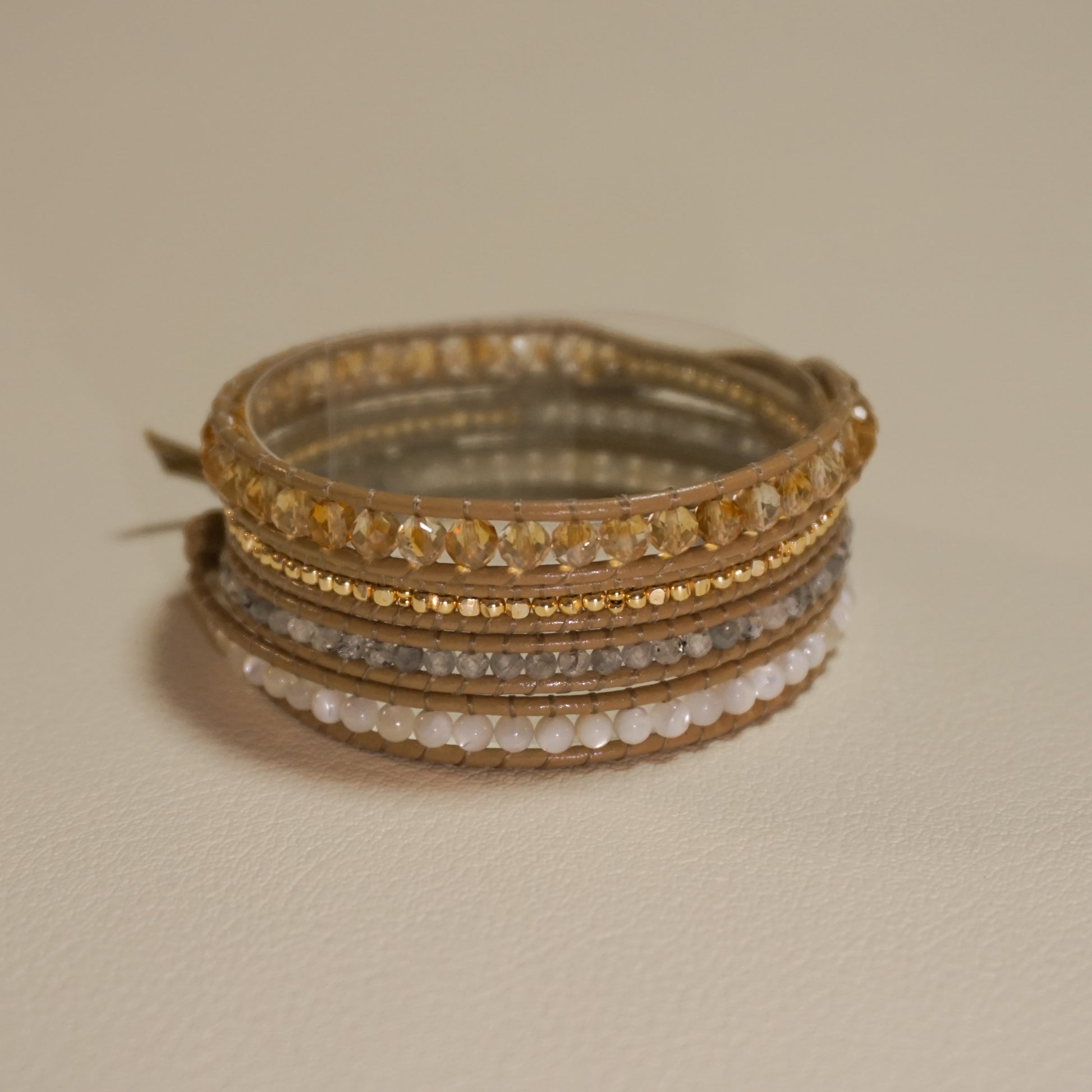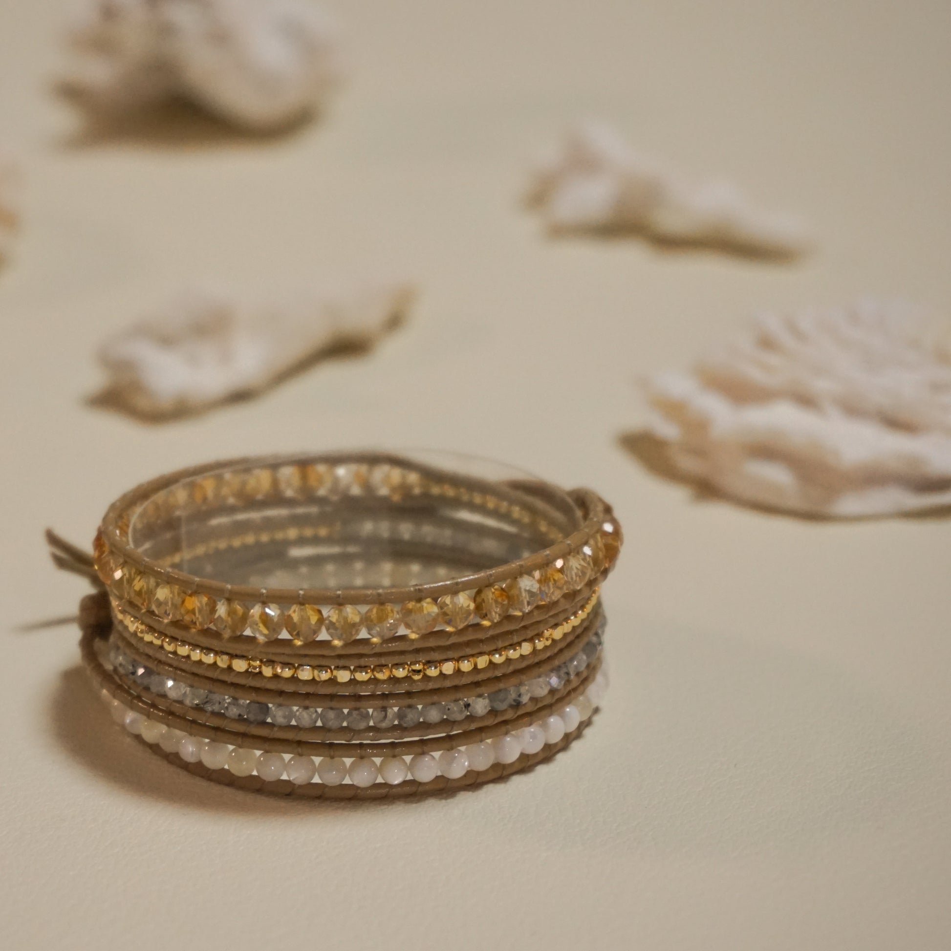 シトリン、ジルコン、マザーオブパール、ガラスビーズ、メタルビーズ、バフレザーコード、合金ボタン