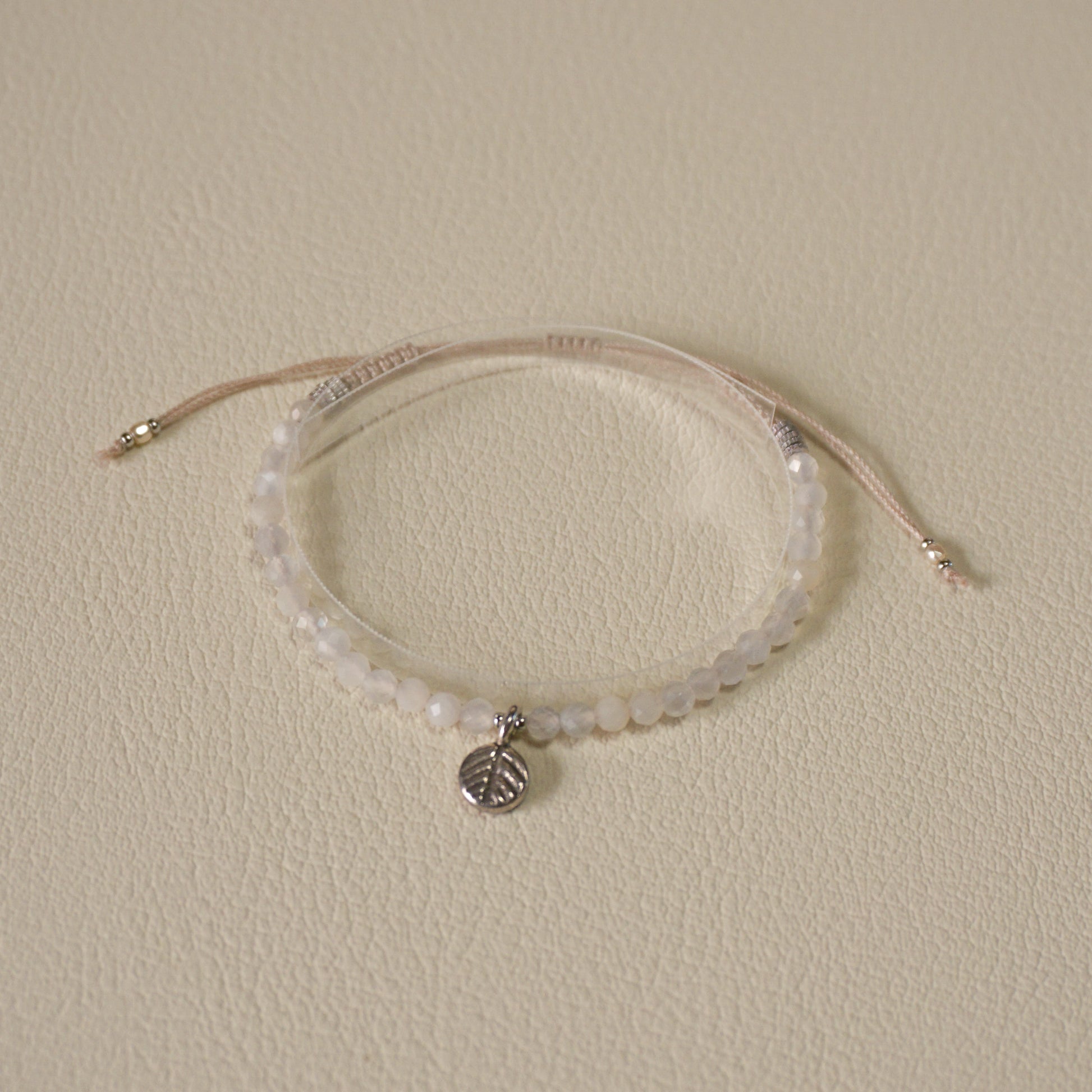カレンシルバーリーフチャーム、ホワイトムーンストーン、ガラスビーズ、メタルビーズ、エジプト綿紐
